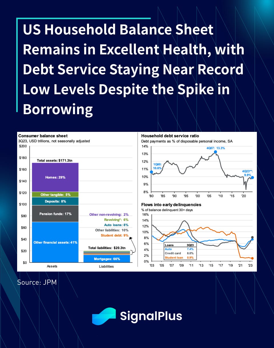 While the absolute debt level of consumers has risen, they pale to the dramatic rise in home values, stock investments, pension holdings, and other financial investments as a collective, with US consumer’s balance sheet sitting at $171 trillion versus liabilities of merely $20 trillion in Q3/23. Furthermore, 66% of the liabilities are in home mortgages, which is probably the “right” debt one wants to carry versus pure consumption-based borrowing.