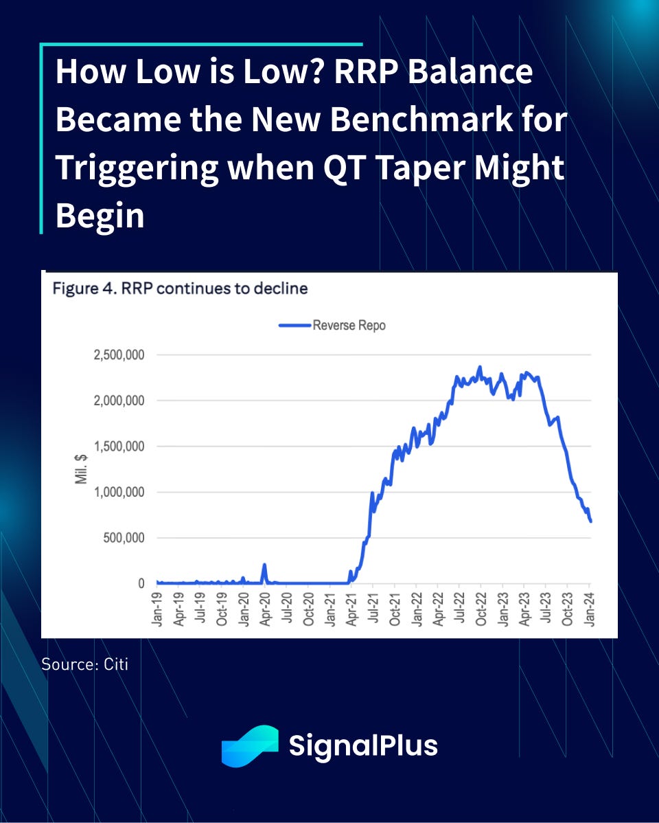 Dallas Fed President followed up a few days (Jan 6th) later stating that it would be appropriate for the Fed to slow down the pace of balance sheet reduction as RRP balances became ‘low’ — however that is defined. NY Fed Williams later mentioned (Jan 10) that the Fed does not seem to be close to the point of slowing balance reduction (yet), which was further echoed by Cleveland Fed’s Mester (Jan 11) that “we still have a lot of reserves in the system so we don’t have to do that imminently at all, I think there’s time… I’m sure this year will be when we start having the conversations and what plan would look like”. Finally, Governor Waller was the latest to chime in on the issue (Jan 16) that “I would say sometime this year will be a resonable thing to start thinking about it”.