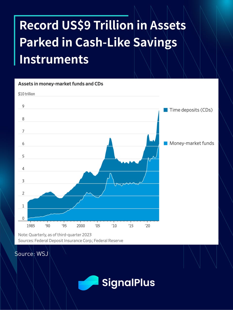 Dry powder. Money on the sidelines. Whatever you want to call it, but a juicy ~5% deposit savings rate has attracted a record US$9 trillion of cash parked in money market funds and similar instruments over the past 2 years.