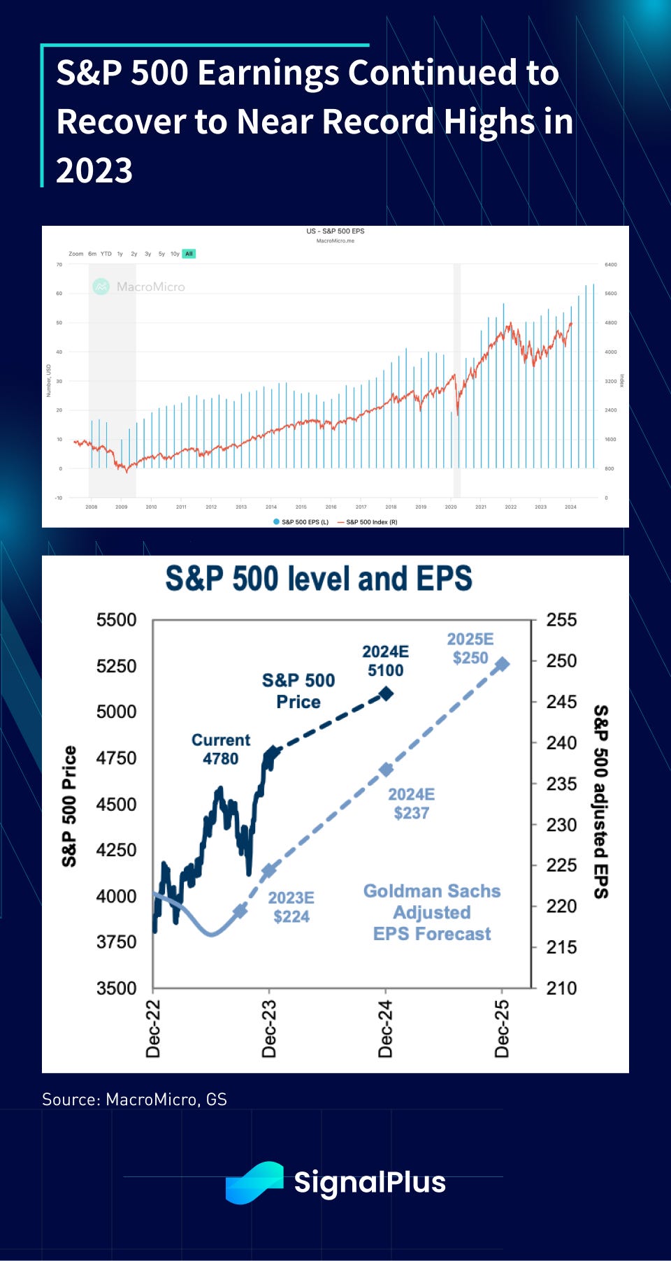 S&P 500 EPS continued to rebound in 2023, ending the year back close to record highs just after the pandemic. EPS growth was up 0.4% vs 2022, an impressive feat given the high watermark and the massive withdrawal of central bank liquidity worldwide.