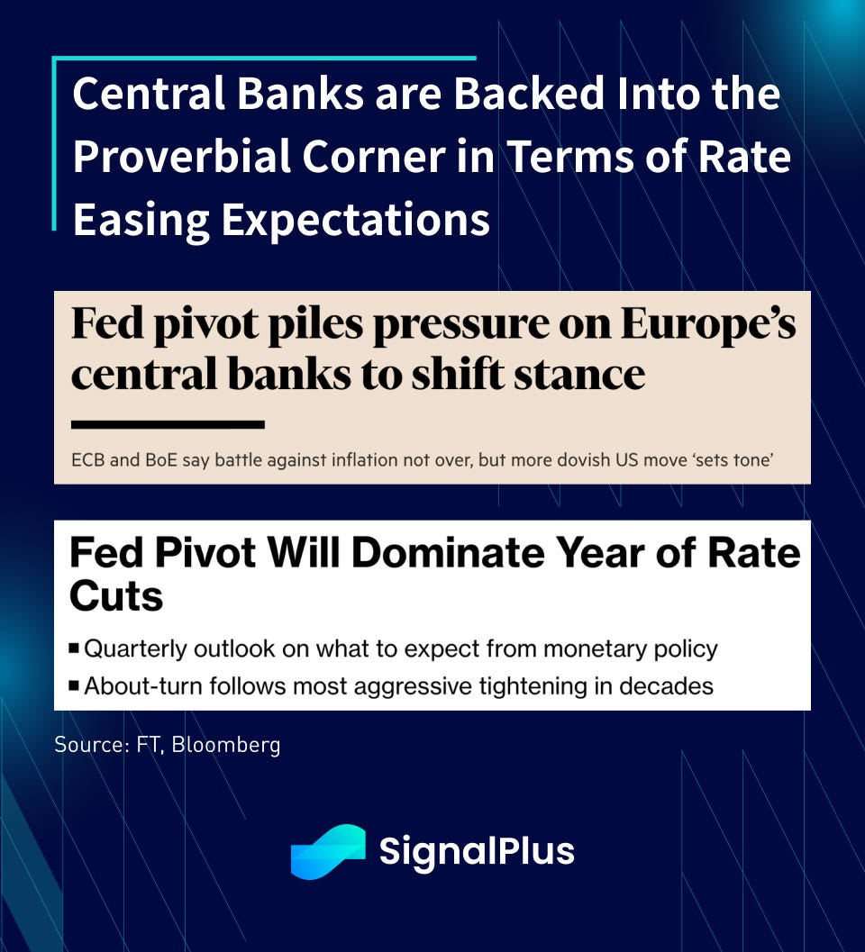 Not long after, Powell followed suit with the Fed’s ‘dovish pivot’ of their own in the December FOMC, where their interest rate dot-plot was revised significantly lower, powering a ~100bp downward shift in Fed Funds forwards and over 150bp of easing priced into 2024.