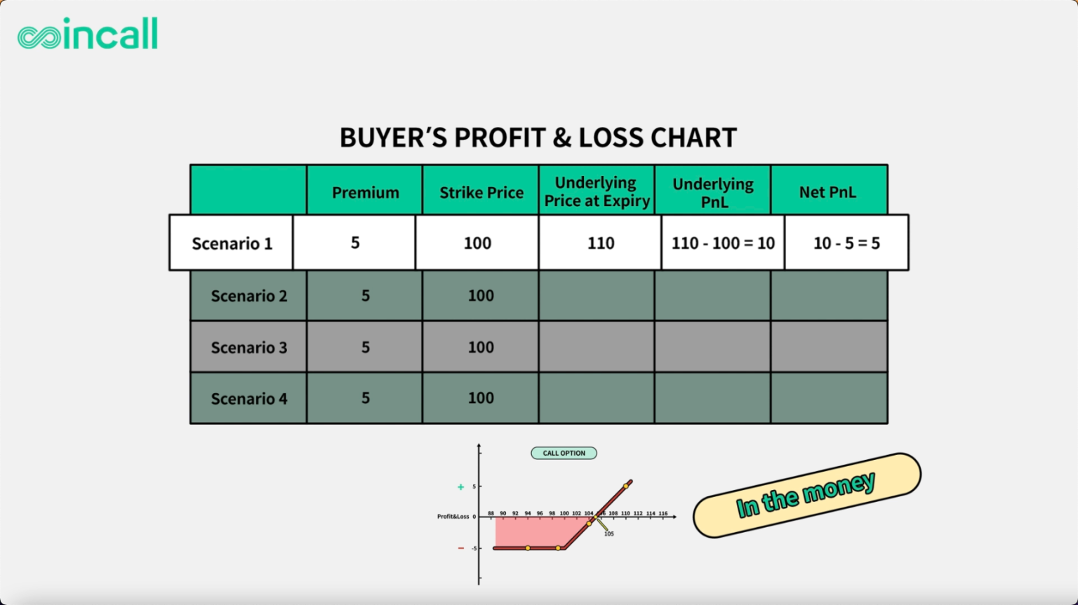 No cenário 1, o preço do ativo subjacente na expiração da opção será $110. Essa opção está dentro do dinheiro. Você exerce a opção a $100. Com o ativo subjacente em $110, isso resultará em um lucro de $10. Se você subtrair os $5 pagos de prêmio pela opção, seu lucro líquido será de $5.
