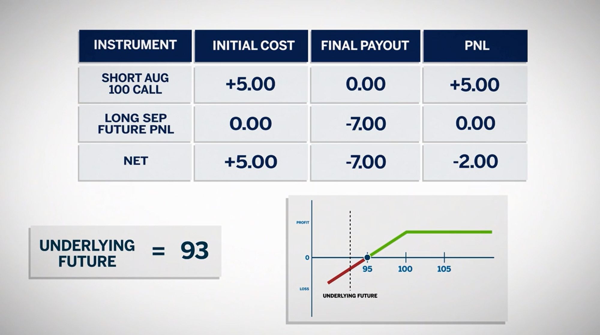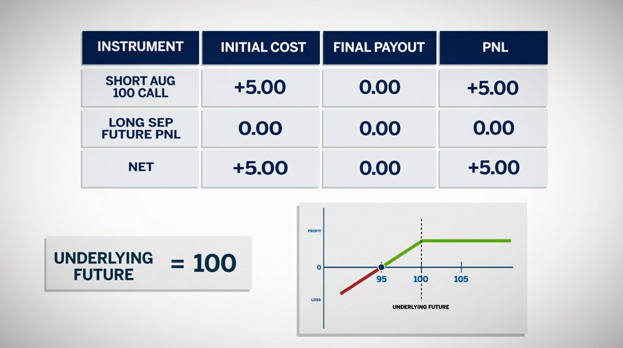 No vencimento da opção de julho, com o contrato futuro de setembro a 100, seu lucro será de $5 devido ao PNL zero do contrato futuro e a call expirando sem valor. Isso permite que ele mantenha os $5 completos do prêmio.