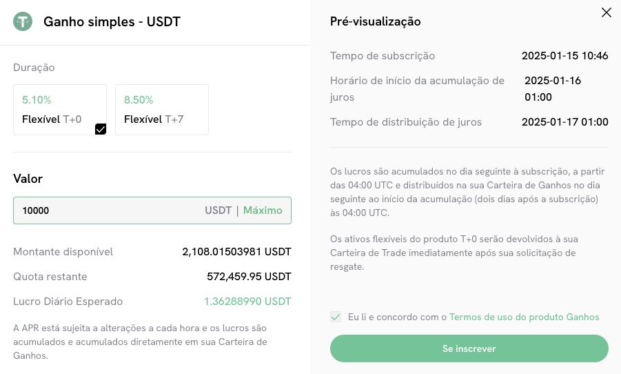 - Valor mínimo: você pode começar com apenas 10 USDT