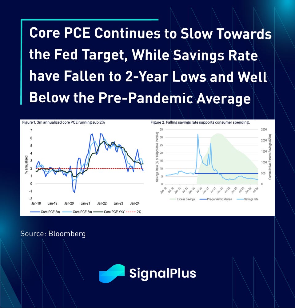 Core PCE inflation rose 0.16% MoM and 2.6% YoY, with healthy personal spending which saw another 0.4% MoM growth in real terms. However, much of the spending strength was powered by a continued fall in the US savings rate, dropping to 2.9% and sitting at the lowest point since June 2022 and below the pre-covid average.