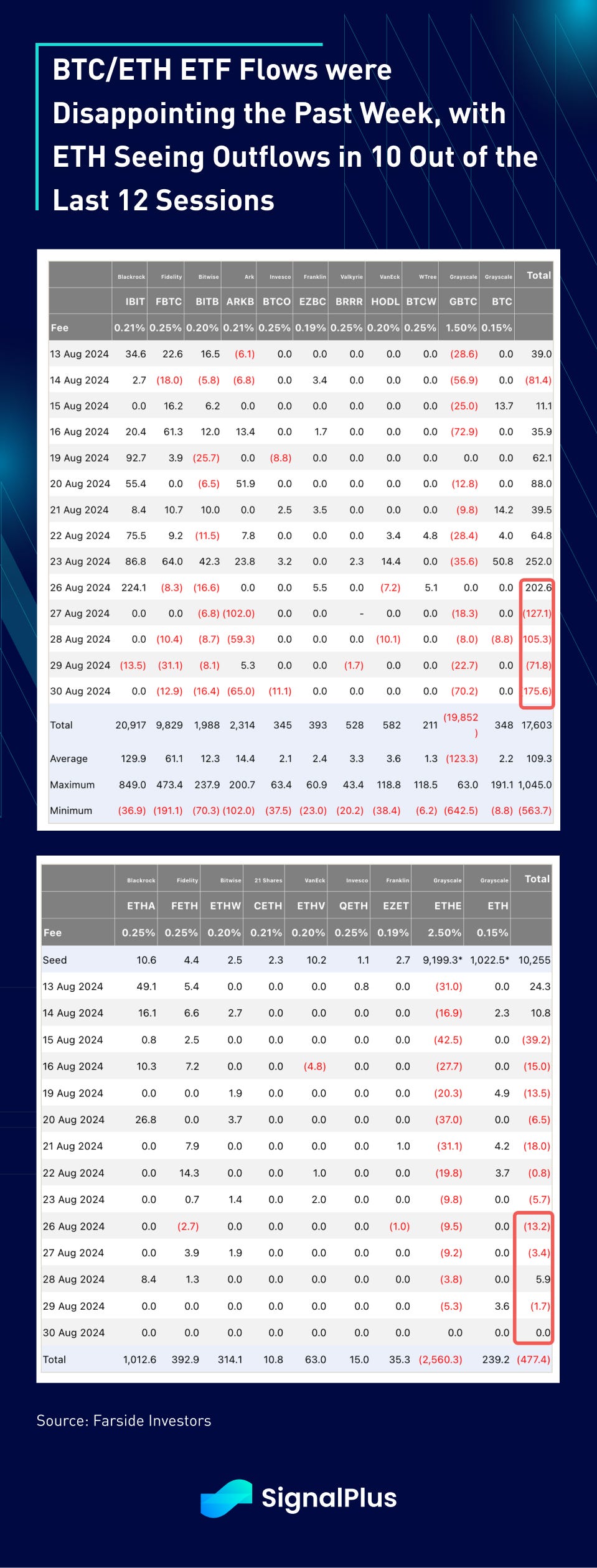 Crypto had an uneventful week but another quietly disappointing week, with both majors and alts losing around 10% on a weekly basis. Between, TG founder Durov’s arrest in France, SEC’s latest actions towards Opensea dampened the overall mood, and the continued outflows across both BTC and ETH ETFs (10 out the last 12 days saw outflows) gave markets little to cheer about.