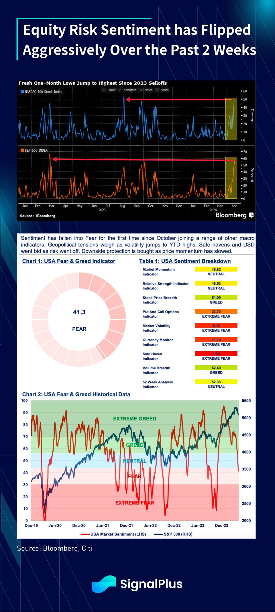 With prices likely driven solely off technicals and positioning in the meantime, a quick look at various sentiment gauges will show that the recent sell-offs had inflicted significant technical damage, although we might be overdue for an oversold bounce in the meantime. The number of Nasdaq and SPX stocks hitting one-month lows hit a recent 1-year high, while Citi’s proprietary sentiment barometer flipped to ‘fear’ territory after the recent sell-offs.