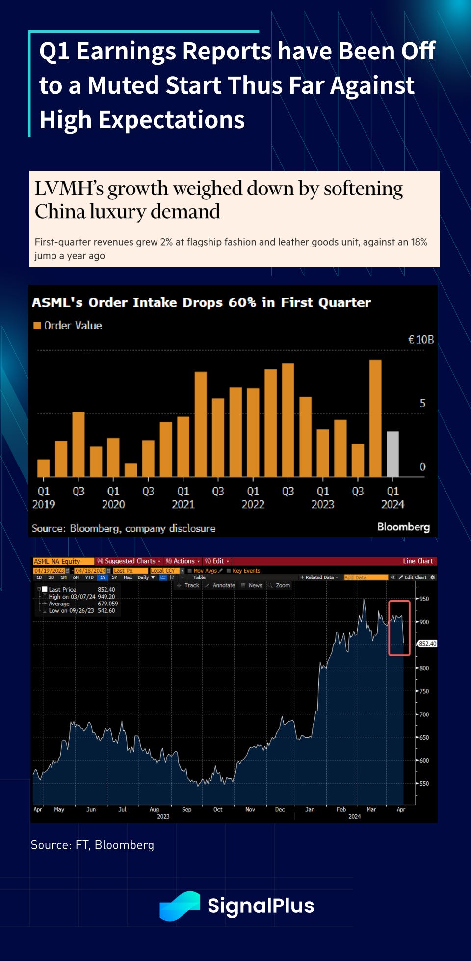 On the earnings side, things have been off to a muted start with banks repeating mixed earnings (JPM missed, GS beat), while LVMH missed top-line sales somewhat on a lowdown in luxury purchases out of China. On the tech side, bookings at Dutch giant ASML fell 61% in Q1 to €3.6bln, widely missing estimates of €4.6bln. A slowdown in new orders from TSCM & Samsung led to weaker results, citing high inventory levels as semiconductor manufacturing capacity has been ramped up globally.
