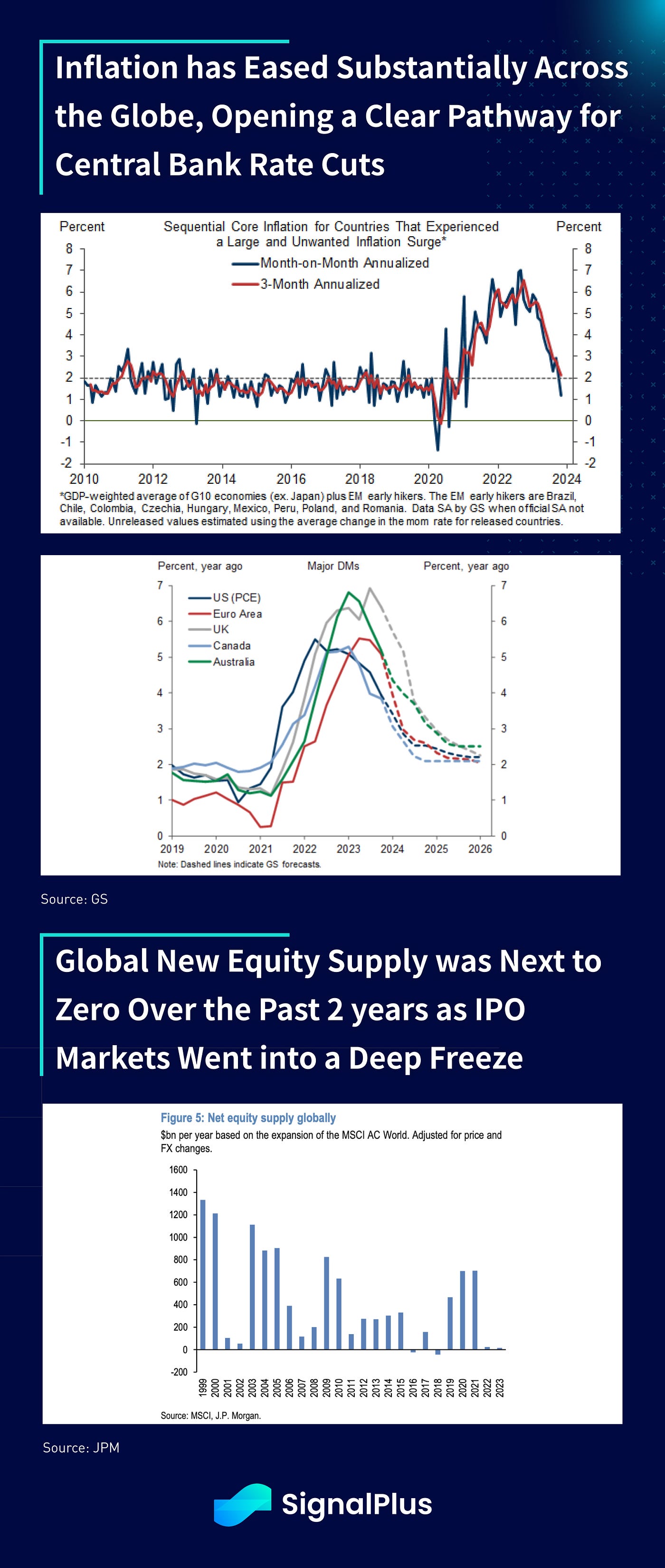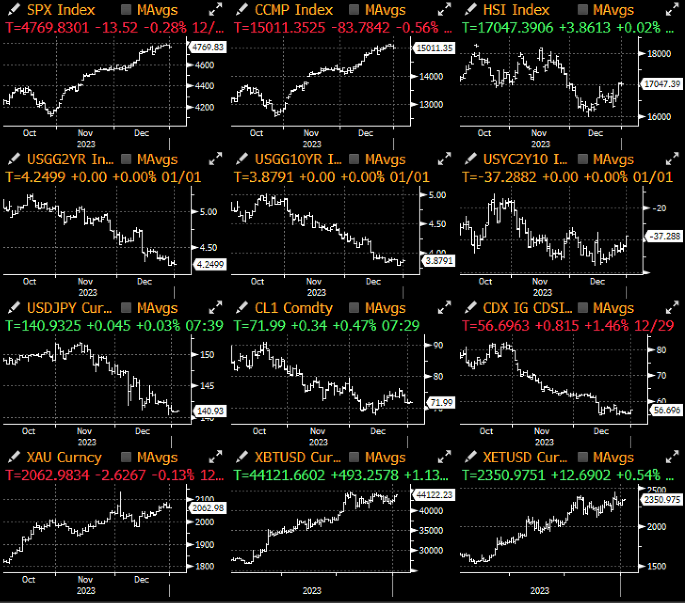 Happy new year! Global asset markets are entering 2024 riding a palpable sense of optimism, with investors bullishly positioned across nearly all asset classes (except the USD) with a wave of interest rate cuts expected across most developed central banks. The past year caught most macro observers off guard as risk assets scaled the wall of worry, with US equities closing at near a record high despite the Fed’s unprecedented hiking campaign, demonstrating once again that macro relationships are complex and constantly evolving.