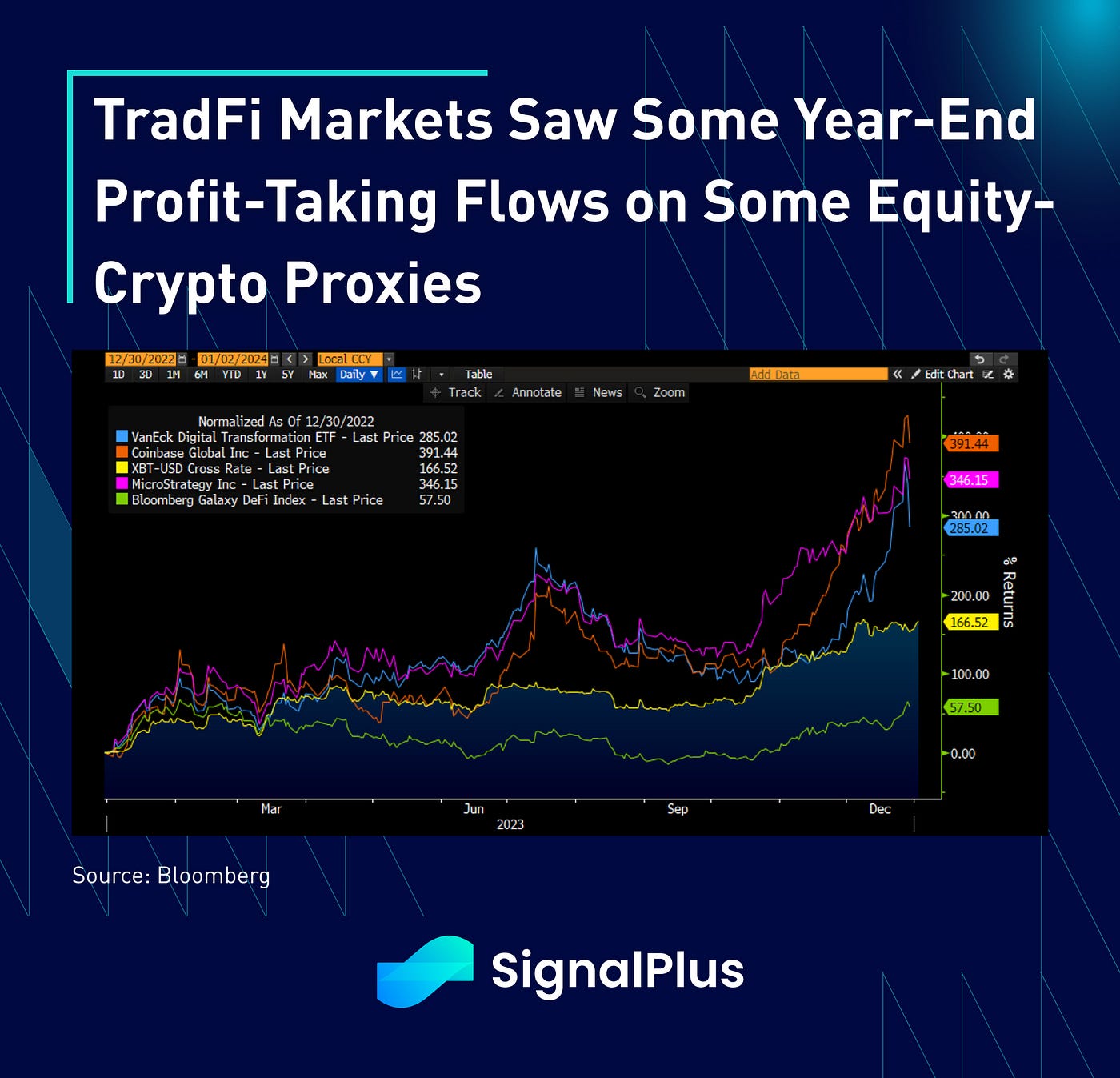 In traditional space, we saw some year-end profit taking flows in ‘equity-crypto’ proxies (eg. Miners) as we near the ETF decision, with the near term flows unclear as we balance the prospect of incoming institutional flows versus a long-dormant supply being unlocked from GBTC. Similar to our view on equities, we would suggest against getting in the way of the near-term market momentum, and would be on the lookout for a potential ‘sell-the-fact’ move later on in Q1. Good luck and happy trading in the new year!
