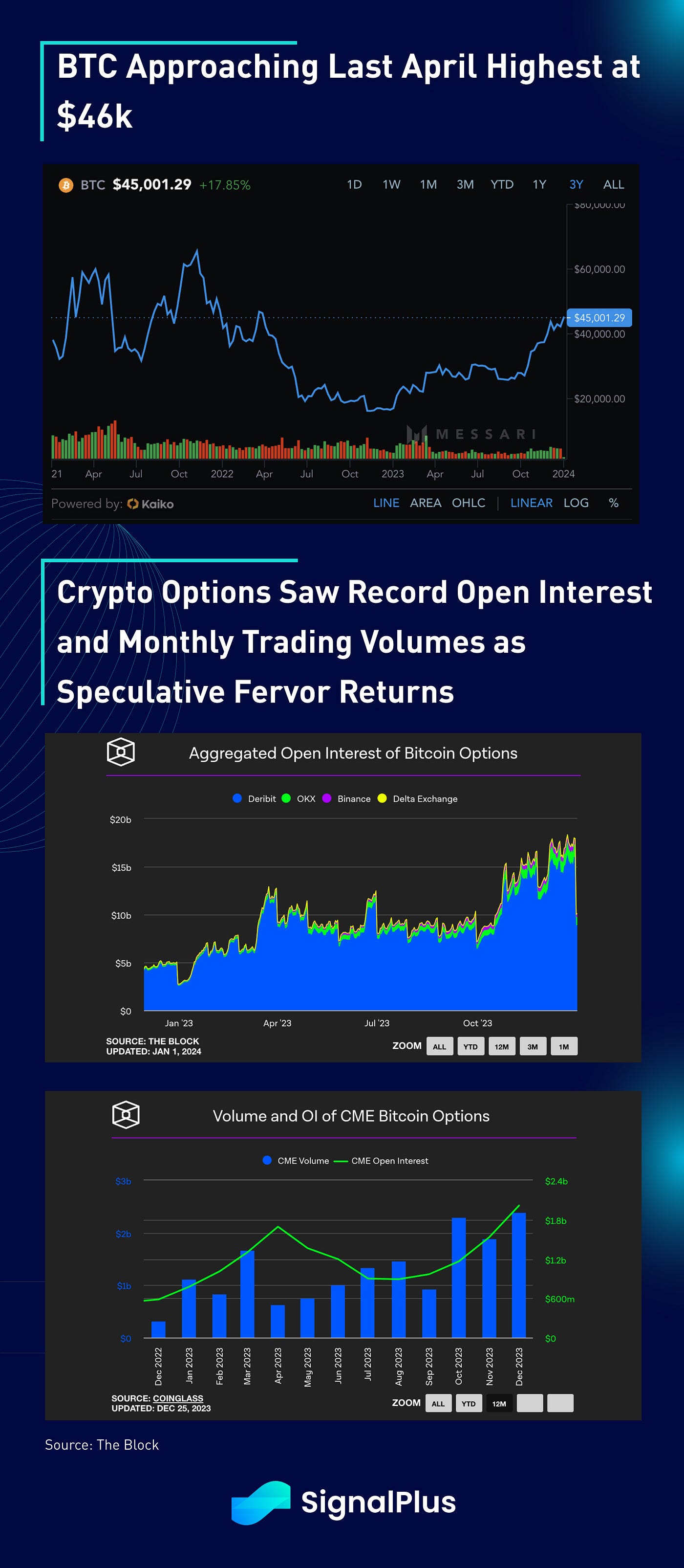 Crypto prices continue to usher with its rapid recovery, as token prices are awash in a sea of green with BTC approaching the last April highs of $46k before we last fell into a year-long bear market. With the SEC expected to give their final approvals on the BTC spot ETFs this week, speculation is running at a fervish pace with crypto options closing 2023 at record open interest and monthly trading volume. Over $11bln of BTC and ETH options expired last Friday on Deribit, with December registered over $1.8bln in monthly volumes, eclipsing the previous highs in October.