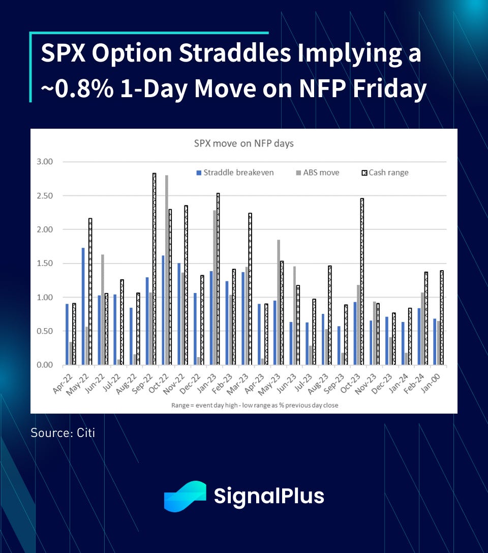 NFP awaits this Friday with consensus expecting a dip in payroll growth to 200k, while the unemployment rate will stay steady at 3.8% and hourly earnings growth steady at +0.3% MoM. Such a data release should be friendly for risk as a continuation of the growth goldilocks scenario. 1-day option straddles on SPX implies around a 0.8% 1-day move, in line with previous NFP releases.