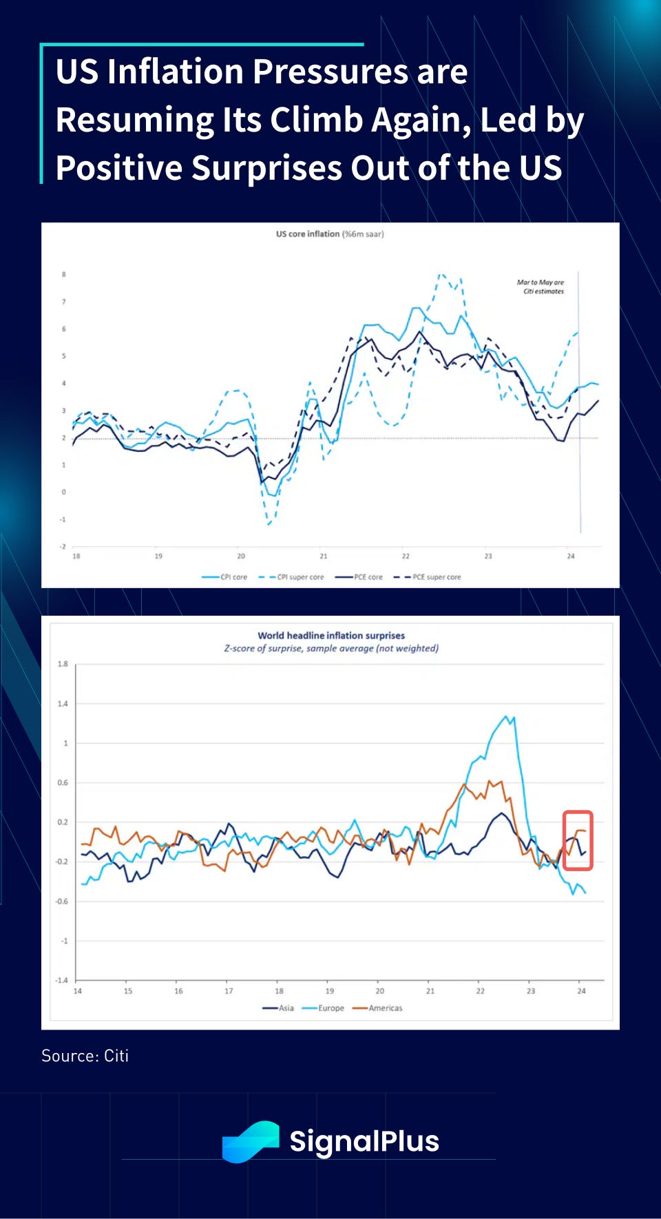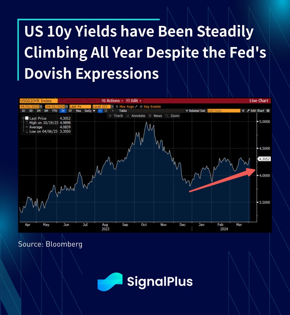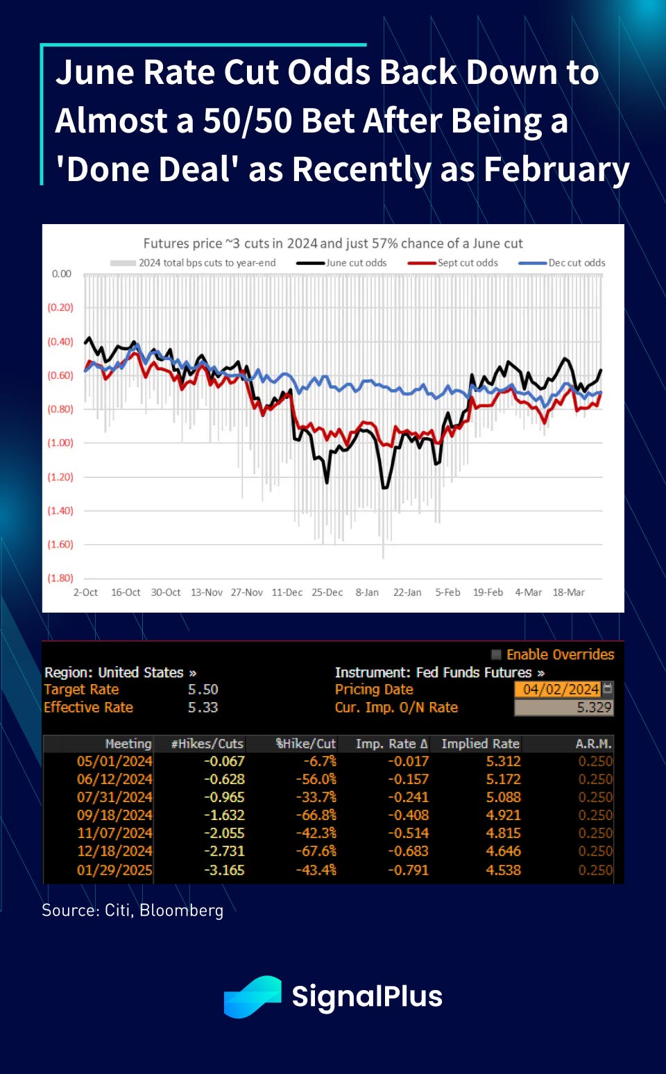 Markets came back from an extended long weekend to a sudden ‘risk-off’ breeze across many asset classes, with Fed’s Powell giving a head-scratching message last Friday stating that the economy is resilient enough to handle the current rate levels, after being undeniably dovish just a week earlier. Speaking right after the PCE release, he stated comments such as “we don’t need to be in a hurry” and “The fact that the US economy is growing at such a solid pace, the fact that the labor market is still very, very strong, gives us the chance to just be a little more confident about inflation coming down before we take the important step of cutting rates”, he didn’t sound like chairman who was eager to slash rates rapidly. Did he get a lot of internal push back (Waller et al.) post his dovish FOMC performance? Were there any political pressures to speak a certain year during an election year? Was he shocked at the market’s dovish reaction to his earlier speech? Your good is as good as ours.