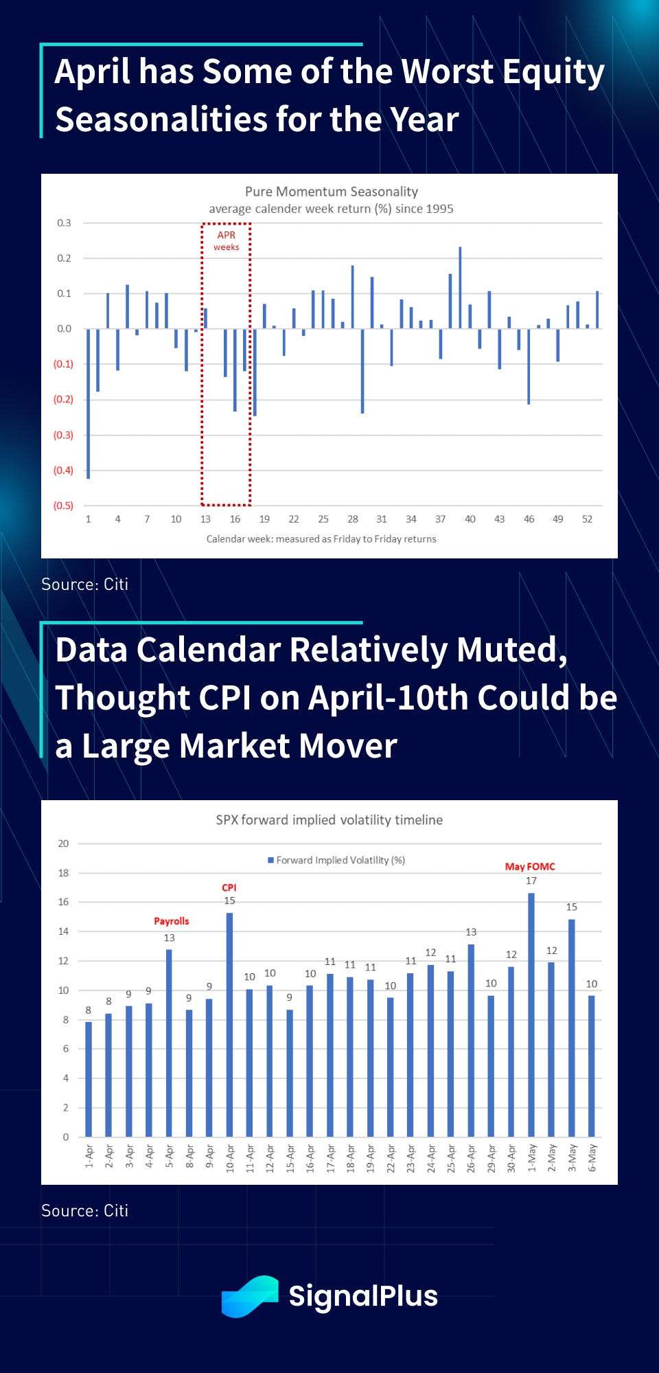 In terms of seasonality, April tends to be a more challenging month for equities, particularly towards the middle of the month, ranking as the bottom-5 worst weeks of the year during that window. Data calendar is relatively quiet outside of NFP on Friday and CPI on April 10th — so perhaps an unfriendly CPI (again) might be the trigger for a potential risk-off move at the end of this month.