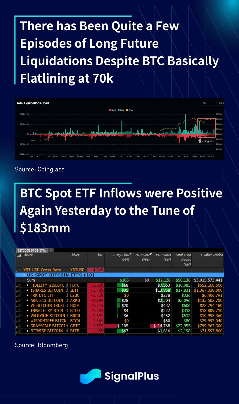 In crypto, while meme-coin season remains in full bloom, BTC prices have flatlined around 70k for the better part of a month now, but with quite a few episodes of long-liquidation as traders are sitting somewhat uncomfortably long. Fund rates remain expensive for longs as positioning remains one-sided, with price action tending to be more negative in Asia time (always the case this morning with the stops-led drop the sub $66k), and more positive in the NY session supported by ETF inflows (+183mm yesterday). Are we simply seeing an extended redistribution trade natives are accumulating long positions and slowly selling them to mainstream via ETF holdings, but not with a lot to show in recent weeks? Keep an eye out for a possible downturn in sentiment as it feels that momentum has started to wane in crypto prices at the moment.