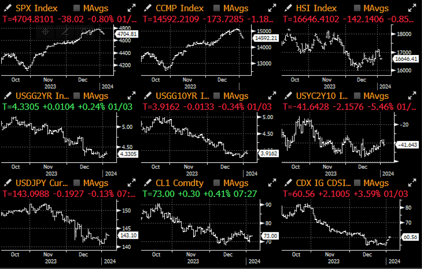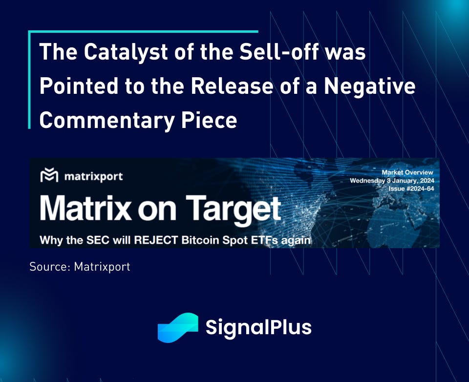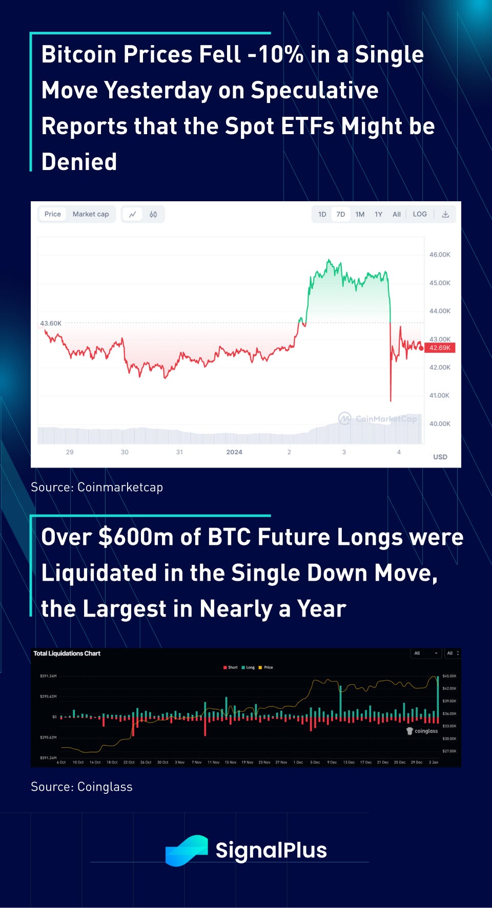 In crypto, we saw the 1st roller-coaster ride of the year, where BTC fell from over $45k to $41k in a single ‘candle’ with over $600mm in long BTC futures liquidated in a hurry, the largest stop-outs in more than 6 months. With speculative fervor running at extremes as we inch closer to the imminent SEC decision, a commentary piece report out of Matrixport suggested that the SEC would reject the spot ETF approval, and was largely blamed for sparking the spot sell-off around the NY open.