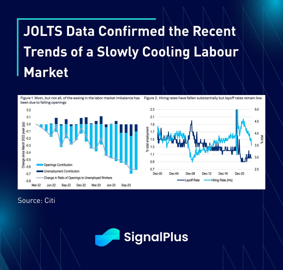 JOLTS job openings fell in November with large openings seen in the construction sector as the red-hot housing sector are finally seeing early cracks in its facade, coupled with revised openings across both the education and health services sectors as well. The quit rate fell further in November down to 2.2%, while the hiring rate also eased off to 3.5%, continuing the recent trend of a weakening labor market. However, the ratio of openings to unemployed remained at an elevated 1.4-to-1 ratio, well above pre-pandemic levels, and lay-off rates also remain low, suggesting no immediate and critical concerns… yet.