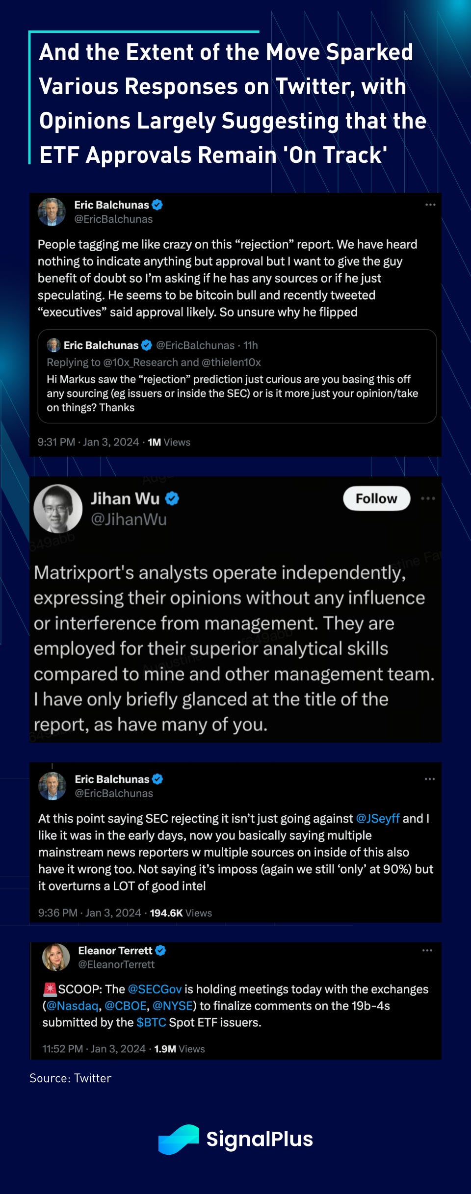 The surprising reaction to the commentary and the extent of pricing carnage sparked various reactions and clarifications on Twitter, including from Mr. Jihan Wu personally, and clarifications from Bloomberg analyst Balchunas that the spot ETF plans remain on track with a “90%” probability based on their own market intelligence. Stay safe out there!