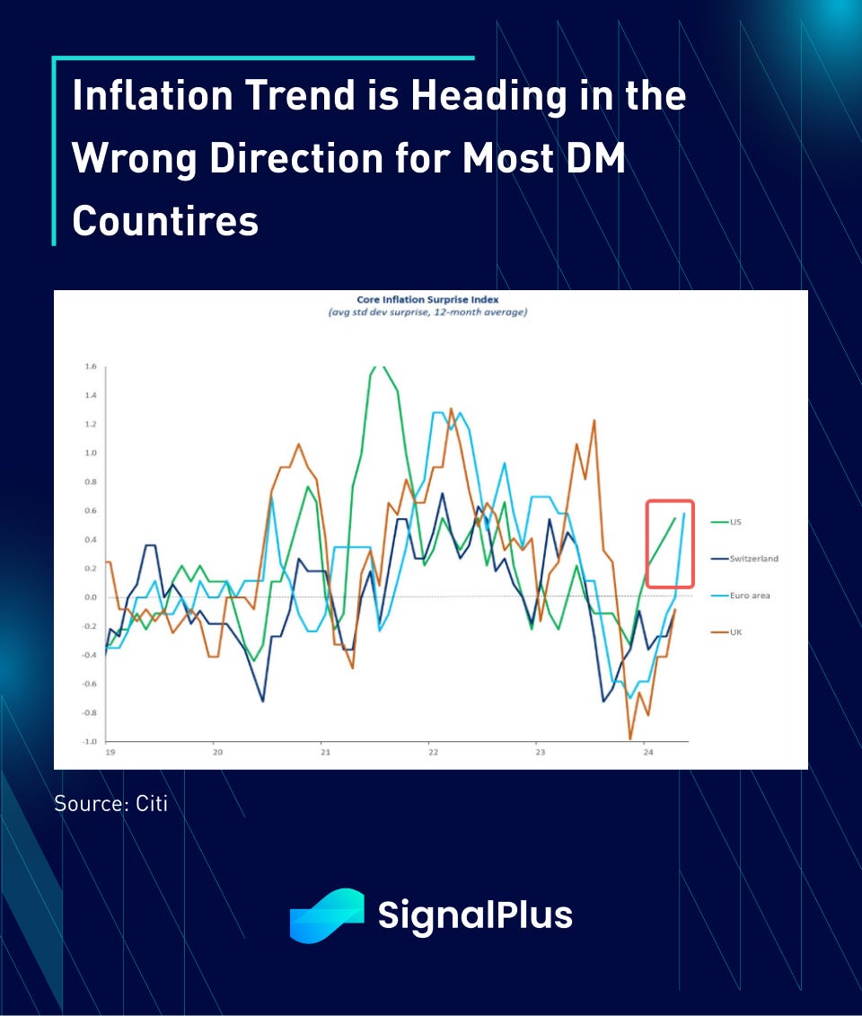 Last week’s data releases spurred quite a bit of macro re-thinking, with US data exceptionalism finally come back down to early in Q1 (GDP revised down, consumption lower), while global inflation momentum have started to surprise back to the upside with Eurozone HICP re-accelerating back to 2.9% YoY (vs 2.7% before).