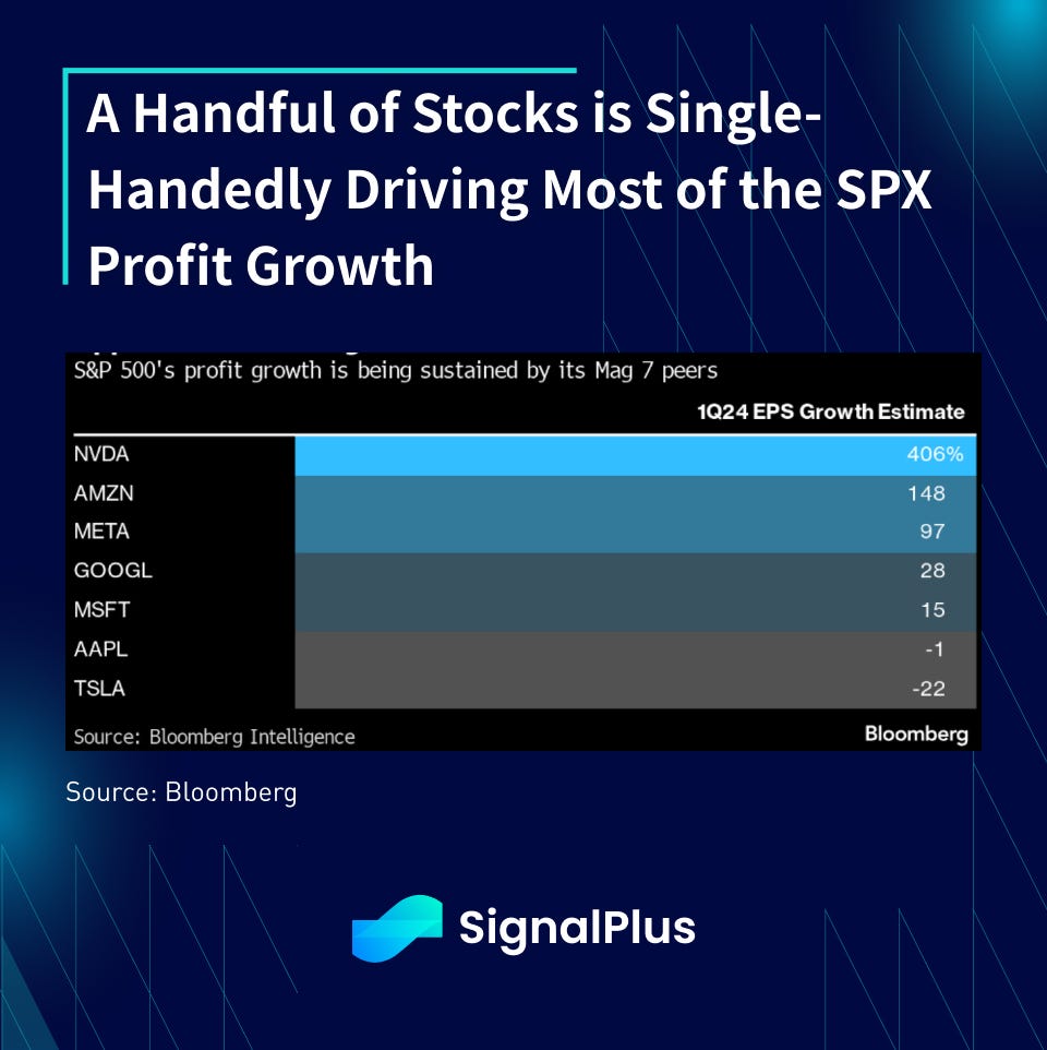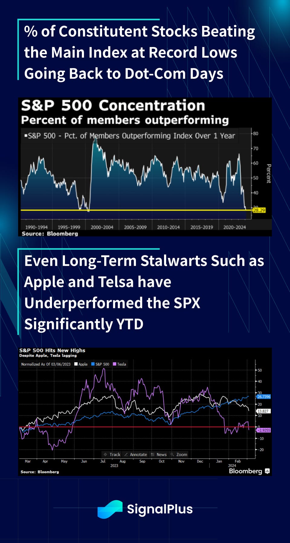 Over in equities, nothing particularly earth shattering, though Bloomberg notes that the performance concentration in the SPX has gotten to record extremes, with the % of members outperforming the index at the lowest levels since the dot-com bubble. Said another way, the rise in the SPX is driven entirely by just a small handful of stocks (e.g Nvidia), with even long-term stalwarts such as Apple and Tesla faltering against the main index YTD.