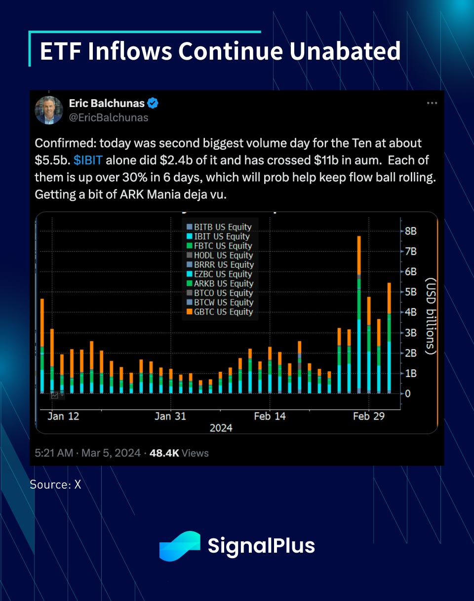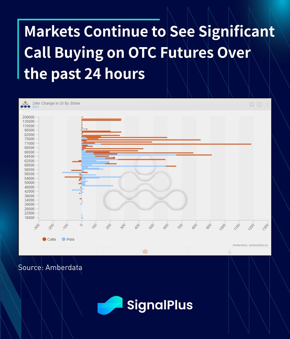On the native side, perpetual funding rates are extremely high with annualized rates gapping to 50%+ over the weekend across many exchanges, with BTC future basis widening to ~30% as well. The FOMO picture is even more evident in options, with a large number of $70–80k call strikes being purchased over the past 24 hours, as expectations of BTC hitting $100k before the summer are starting to rise as the ‘everything rally’ goes on for another day. Stay safe everyone!