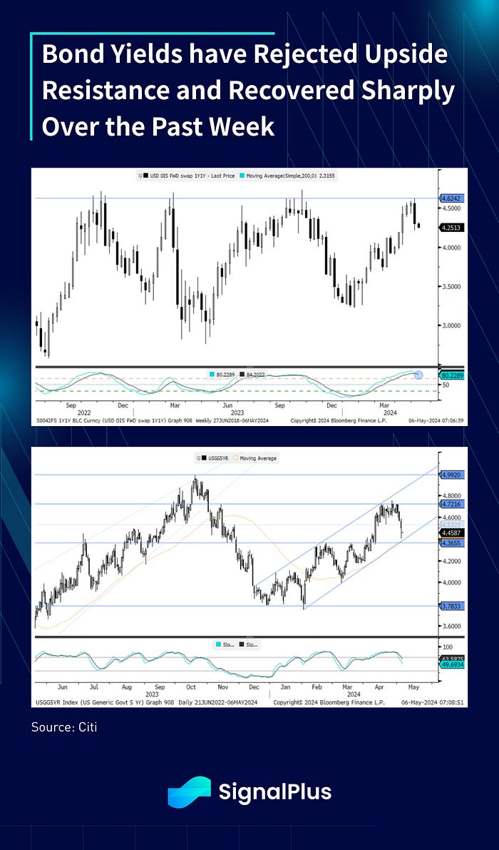 Speaking of momentum, bond yields have recovered smartly after testing and rejecting upside ceilings, with yields falling over 20–30bp in the past week alone. On the equities side, SPX futures have recovered its 50d MA with the recent all time highs back within shooting distance, though near term technicals do look a bit overbought. Cross asset volatility has also come down, with equities falling back to their cycle lows, with rate and FX vol close on its heels, especially with USDCNH and USDJPY settling back into their recent ranges. We maintain our recent view that markets are likely to grind slowly higher over the near-term, until markets decide to have another reckoning of when ‘bad (economic) news’ is decidedly ‘bad news’ for earnings and growth down the line.