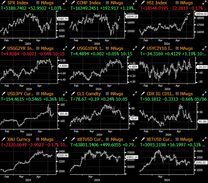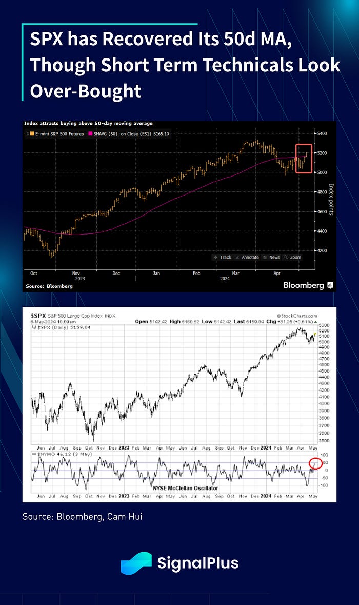 A very quiet session in the markets buoyed risk sentiment as we highlight, as markets carried on with their inertia after last week’s dovish developments (Fed policy asymmetry towards weaker labour markets, softening JOLTS/NFP data, slowing economic data, and a market caught short fixed income exposures). A lack of 1st tier data until CPI on May 15th (one week away), with only ~7% of SPX market cap reporting earnings, and no pending speeches from Fed heavyweights in Powell and Waller will likely leave markets to be dominated by technical price action in the near future.