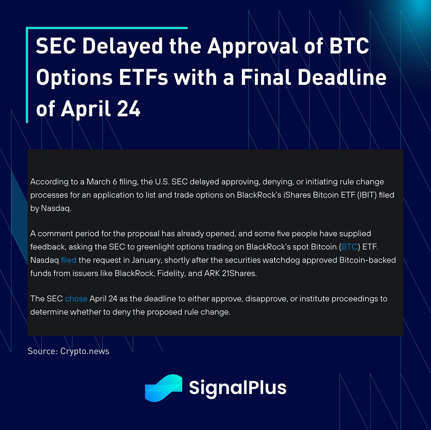 Speaking of options, the SEC (expectedly) delayed their approvals of the BTC ETF Option filing, which was filed by the likes of Nasdaq and CBOE. The final deadline will be on April 24 for the agency to either approve or deny these crypto ETF options, but we believe that it’ll just be a matter of time before options enter the fray to add another risk dimension to crypto markets. As always, the SignalPlus platform is here and ready for all your crypto options needs, so you can be well ahead of the curve!!!