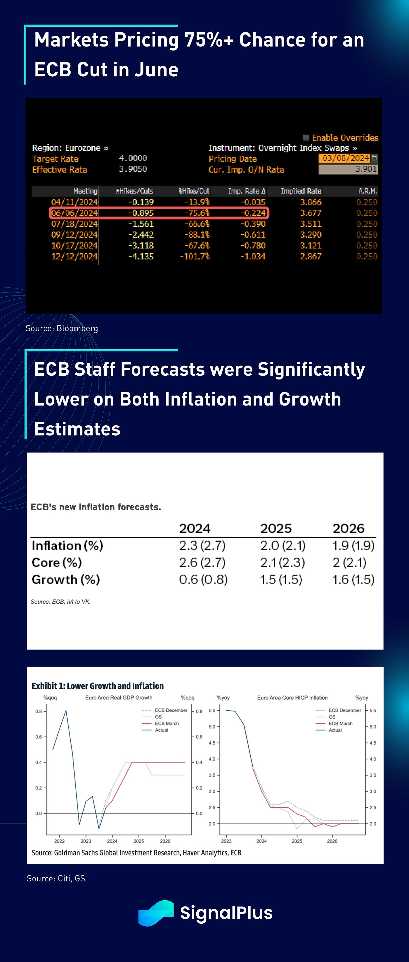Despite keeping rates on hold, yesterday’s ECB projections showed significant downgrades to both growth and inflation, with 2025 price trends now approaching back to policy targets on both headline (2%) and core inflation (2.1%). While President Lagarde offered little on the upcoming pace of cuts, a healthy buffet of dovish headlines were sprinkled throughout the Q&A: