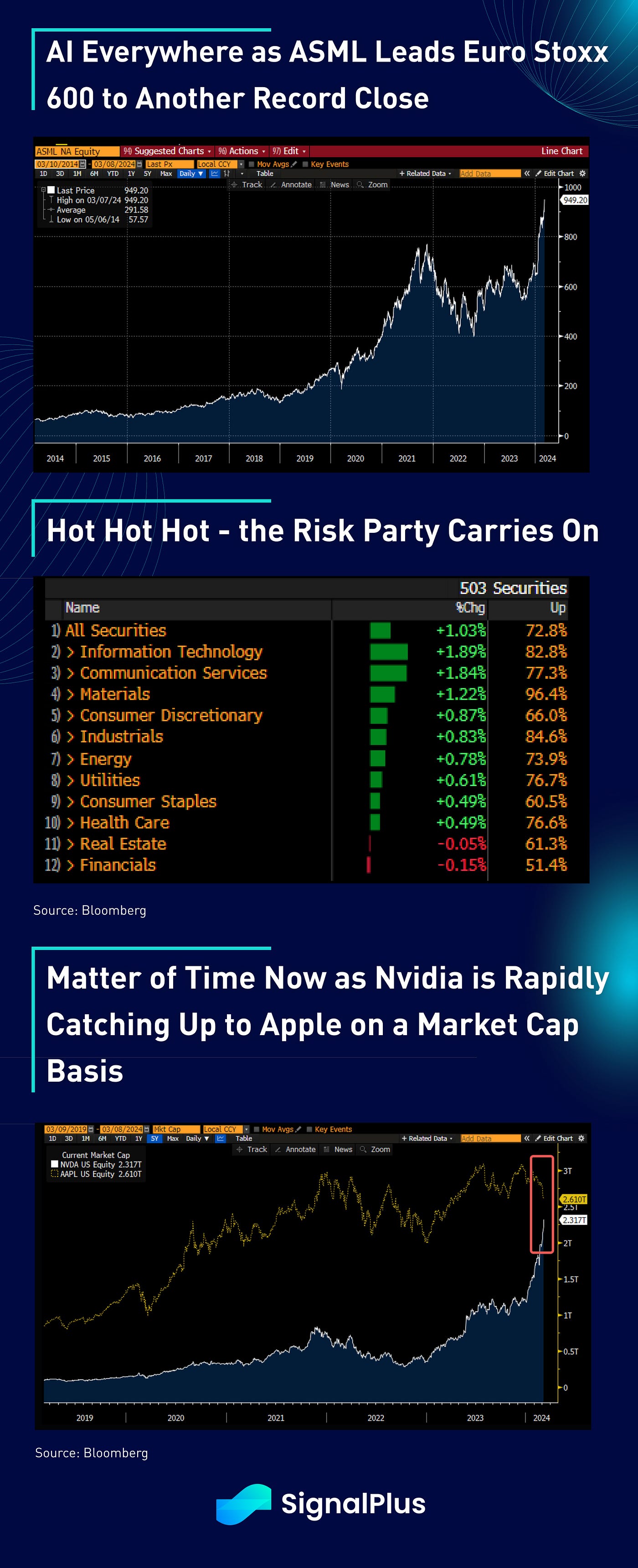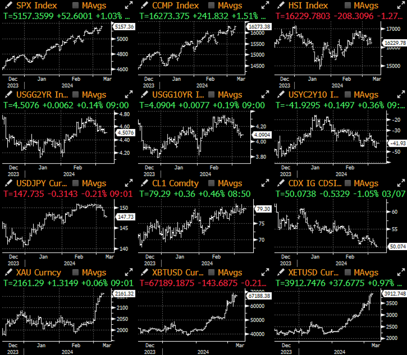 In equities, Euro Stoxx 600 hit a new record high thanks to ECB and chip-equipment manufacturer ASML powering the index with its own record close. In the US, the Nasdaq rallied by 1.5% and the SPX by 1%, driven by the usual culprits. Nvidia’s GTC conference on March 18–21 could be the next event market for AI and tech stocks later this month, though it appears to be a matter of time before the chip giant catches up to Apple on a market cap basis.