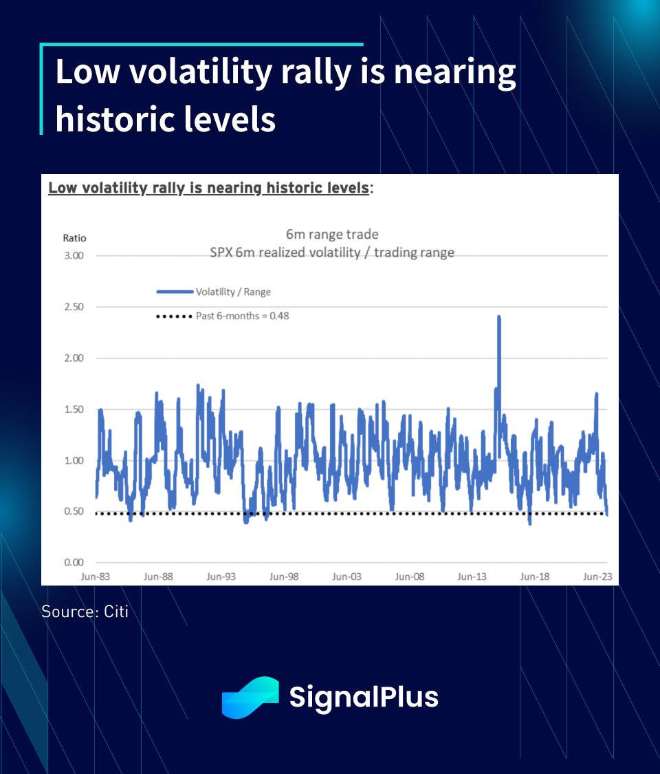 Speaking of volatility, Citi reports that the SPX has rallied 23% in the past 6 months, with a max/min trading range of 24.4%, and realized volatility stuck at trough levels at just 11.7%. The ratio of volatility to trading range is at the lowest level since January, and at the 1st percent-tile since 1983. Implied correlation has also fallen to decade lows as macro event risks have all but dissipated, signaling high (extreme?) levels of risk-complacency, with both economic performance and corporate earnings firing on all cylinders.