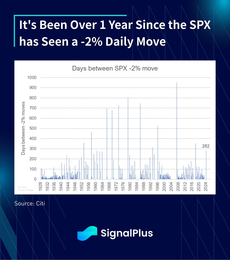 Said in another way, the SPX hasn’t had a -2% day since Feb 2023 (whereas BTC appears to have 2% moves every 8 hours these days), the 12th longest streak since 1928 according to data compiled by Citi. In context, the longest streak was >900 days between 2005 and 2008, though the complacency in US equities certainly stands in sharp contrast with current world affairs.