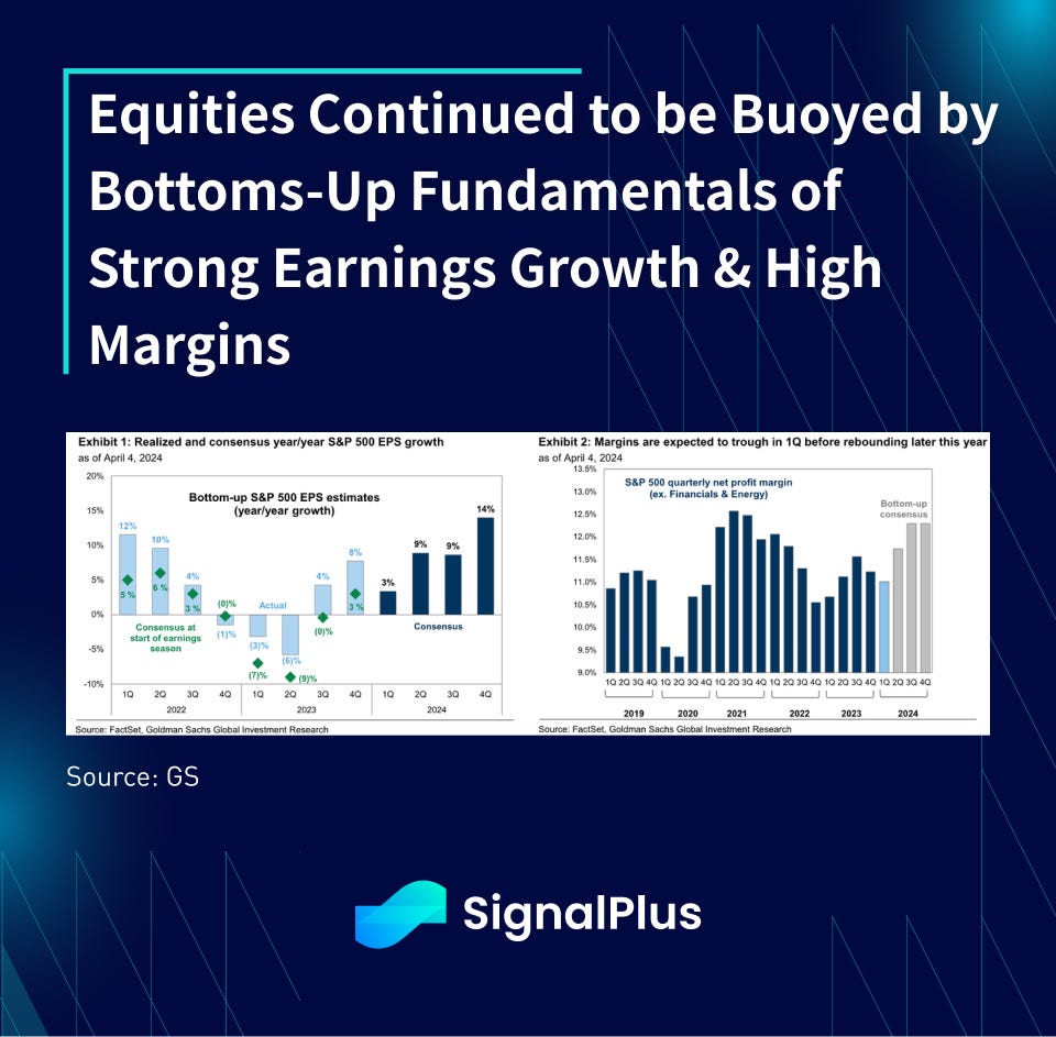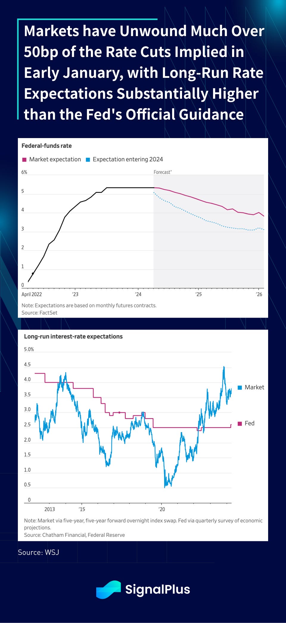 The fixed income market has fully bought back into the “higher for longer” mantra on rates, with markets pricing out well over 50bp of implied rate cuts compared to early January, and both 2yr yields and long-term rates are now pricing substantially higher levels than the Fed’s official guidance.