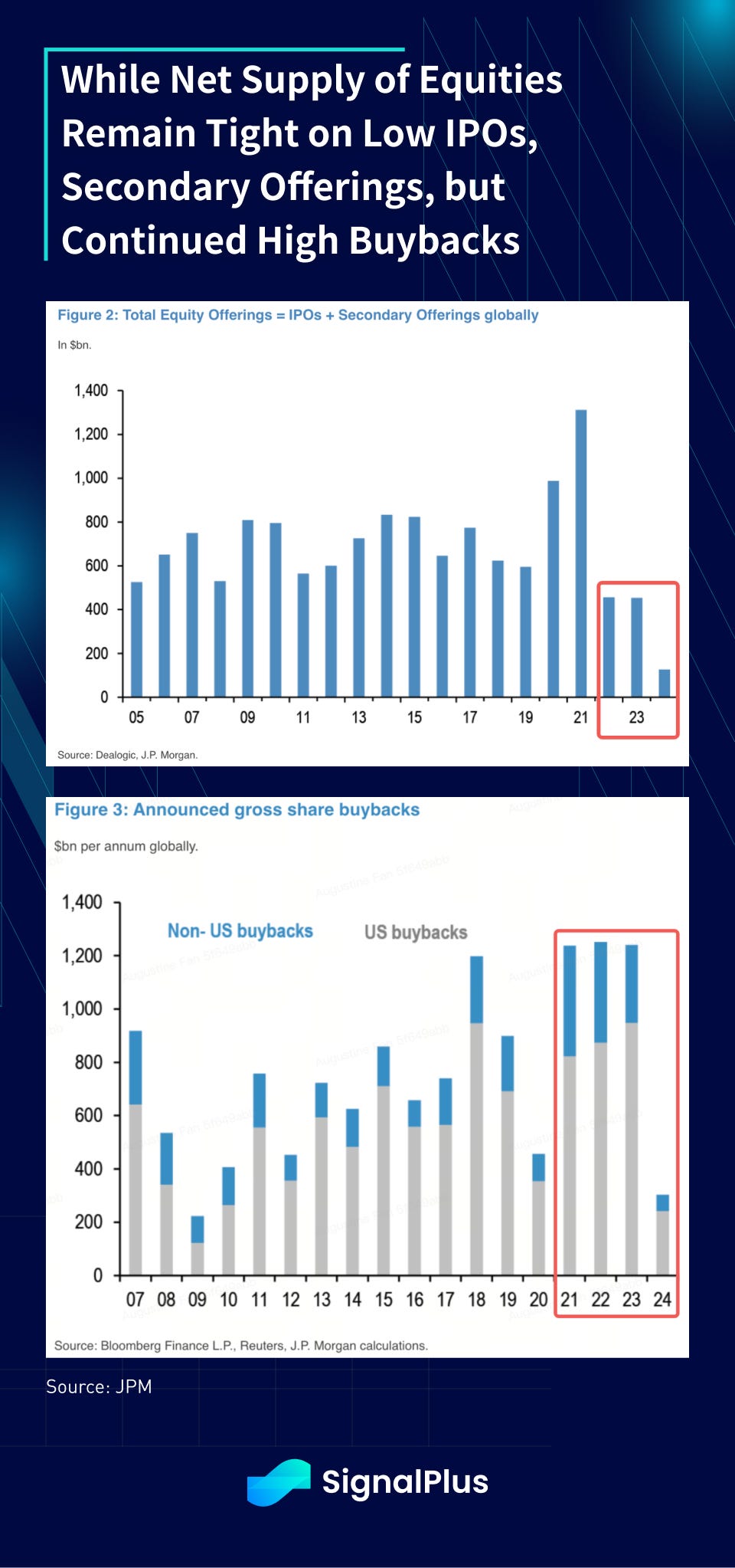 With that being said, from a bottom-up perspective, equities continued to be supported by robust earnings growth and corporate margins staying at historically high levels. Furthermore, the net supply of equity (secondary offerings + IPOs) continues to shrink versus years past, while buybacks have remained strong with 2024 looking to be the 4th consecutive year with ~$1.2 trillion in annual buybacks. It would appear that scarcity doesn’t just apply to Bitcoin only, but the supply of good stocks also appear to be in short-supply against the ever expanding fiat denomination base.