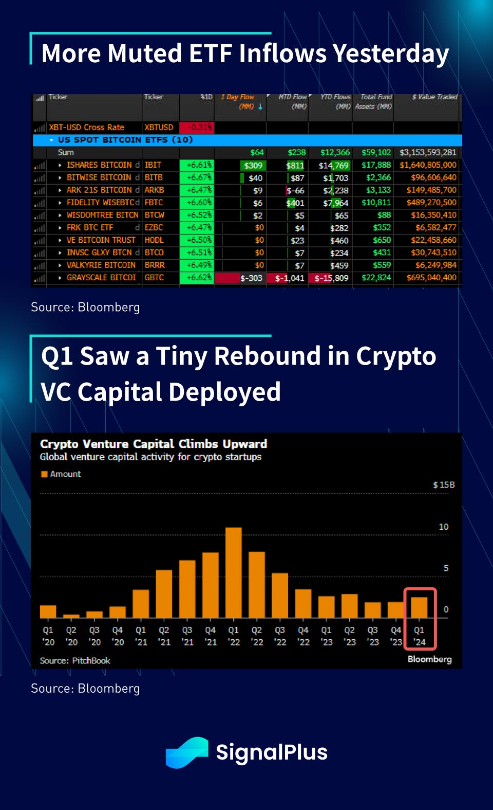 Crypto prices continued their rebound ascent after washing out leveraged longs in the past week. Prices are just a whisker away from all time highs as different altcoins continue to rotate and enjoy their day in the sun. ETF inflows were more modest at $64M yesterday, with BlackRock inflows basically matching GBTC outflows. Finally, Bloomberg reported a small rebound in crypto VC capital deployed in 1Q24, a good sign to see but still a far cry from 2022 despite Bitcoin prices having retraced back all its losses.