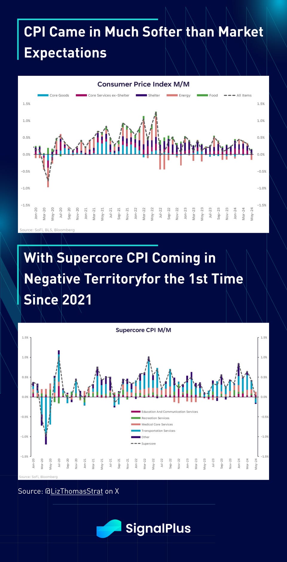 The big macro double-header day was finally upon us, and things certainly didn’t disappoint. CPI started us off with a much softer than expected print, with core rising 0.16% MoM (lowest since August 2021) vs consensus estimates of 0.3%, with particular softness seen in the ‘supercore’ CPI which managed to hit negative territory in May. Services spending fell, good prices were flat, and shelter inflation rose but stayed within manageable territory. Post CPI, Wall Street economists were quick to update PCE forecasts from 2.8% down to 2.6%, and moving in the right direction towards the Fed’s long-term target.