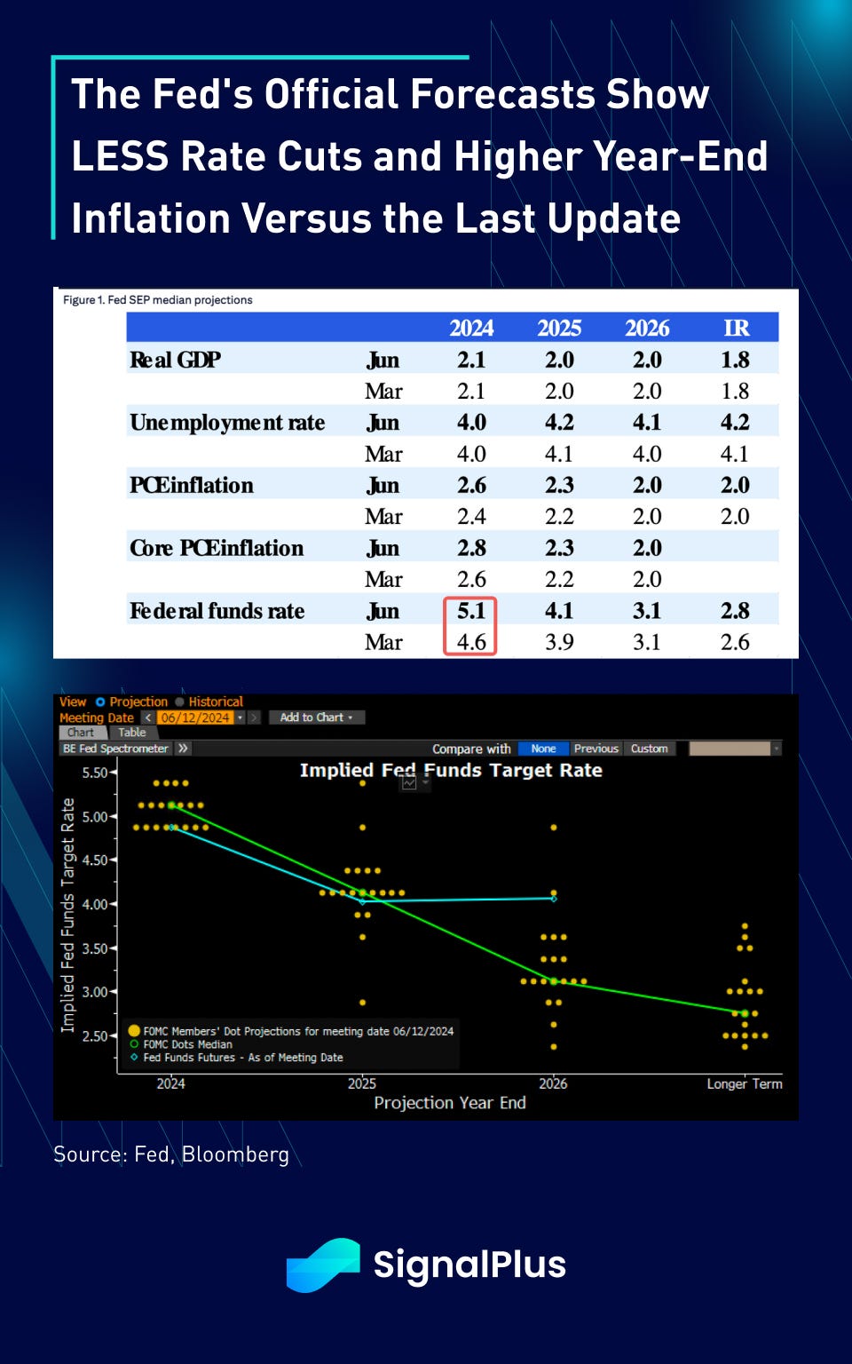 Interestingly, the initial FOMC statement and ‘dot-plot’ arrived with a bit of a hawkish shock, with the latest Fed forecasts showing just ONE rate cut in 2024 versus THREE from earlier. Furthermore, core PCE inflation is projected to end the year at 2.8%, higher than the 2.6% previously.