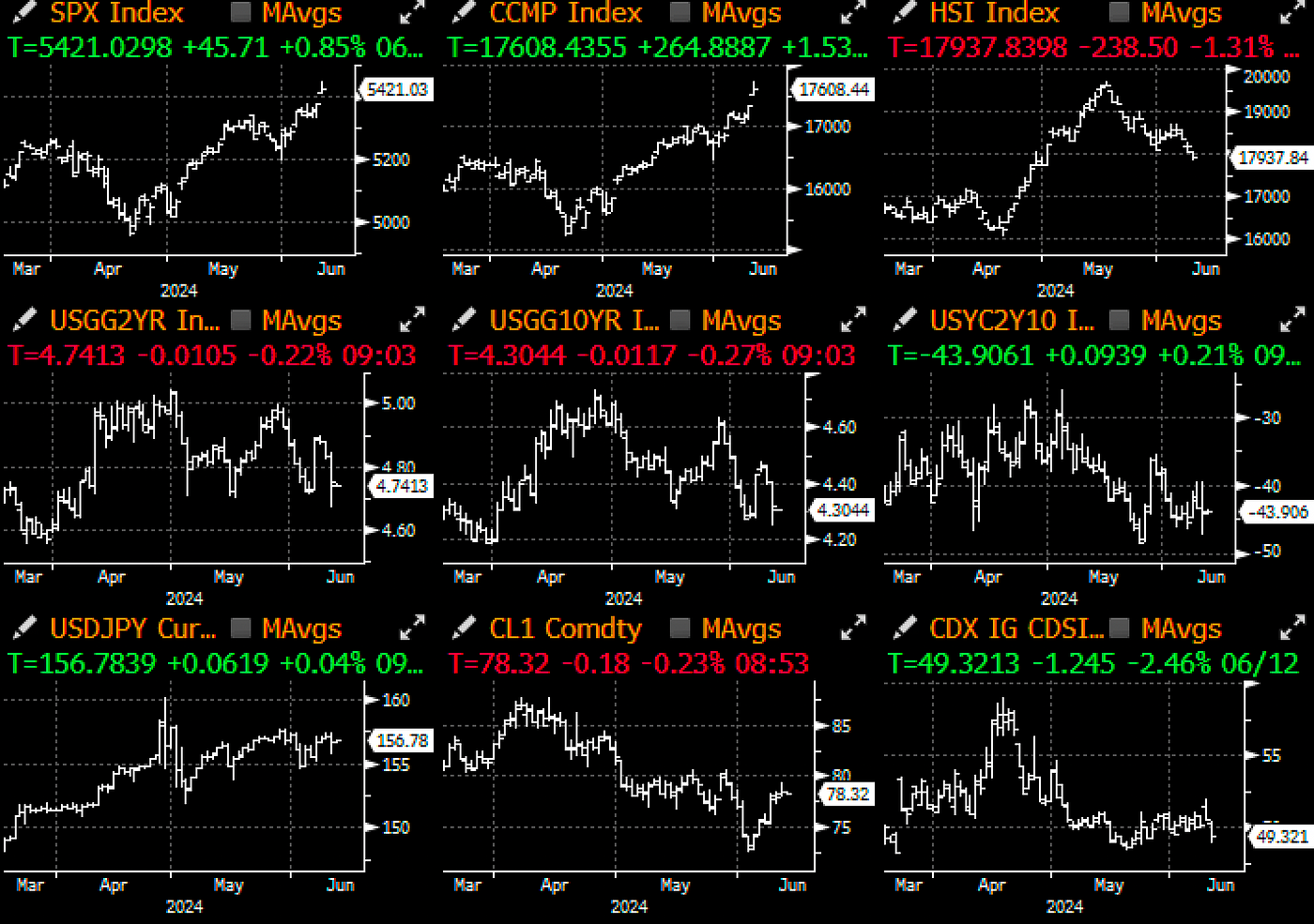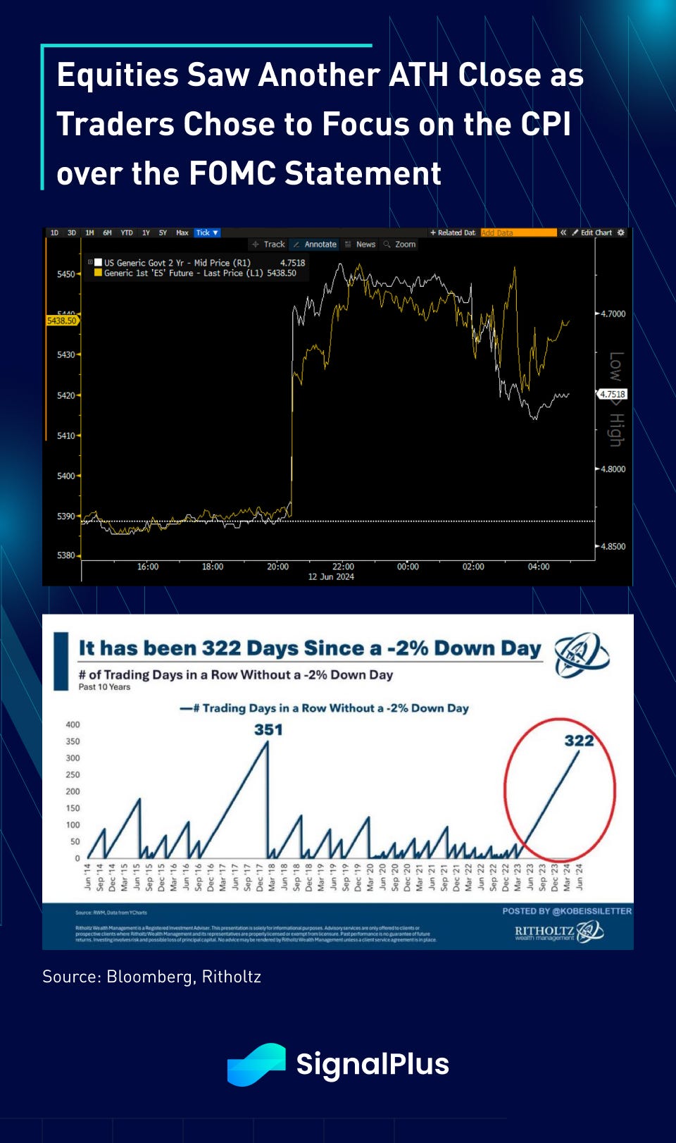 When all is said and done, Bloomberg noted that Powell mentioned inflation 91 times vs 37 times of the labour market, suggesting that pricing pressures remain top of mind. Equity markets took the cue and decided to re-focus back on the softer CPI from before, leaving us close to ATHs at around 5438 on the SPX, while 2yr treasuries settled at ~4.70% and 10y at ~4.3%, both around the lows of the week. The SPX is now on its 2nd longest streak in history without a -2% down day. Just another month until we can set another risk-on record for this cycle!