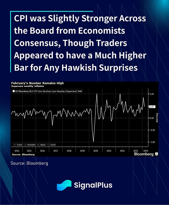 US CPI increased by 0.4% in February across both headline and core, with broad-based gains. Energy bounced +2.3%, gasoline +3.8%, services +0.5% and shelter added +0.4%. Super-core inflation remained high at 0.47% and well above Fed targets, though the bar for a hawkish surprise appeared quite high and risk assets managed to rally strongly after the dust settled.