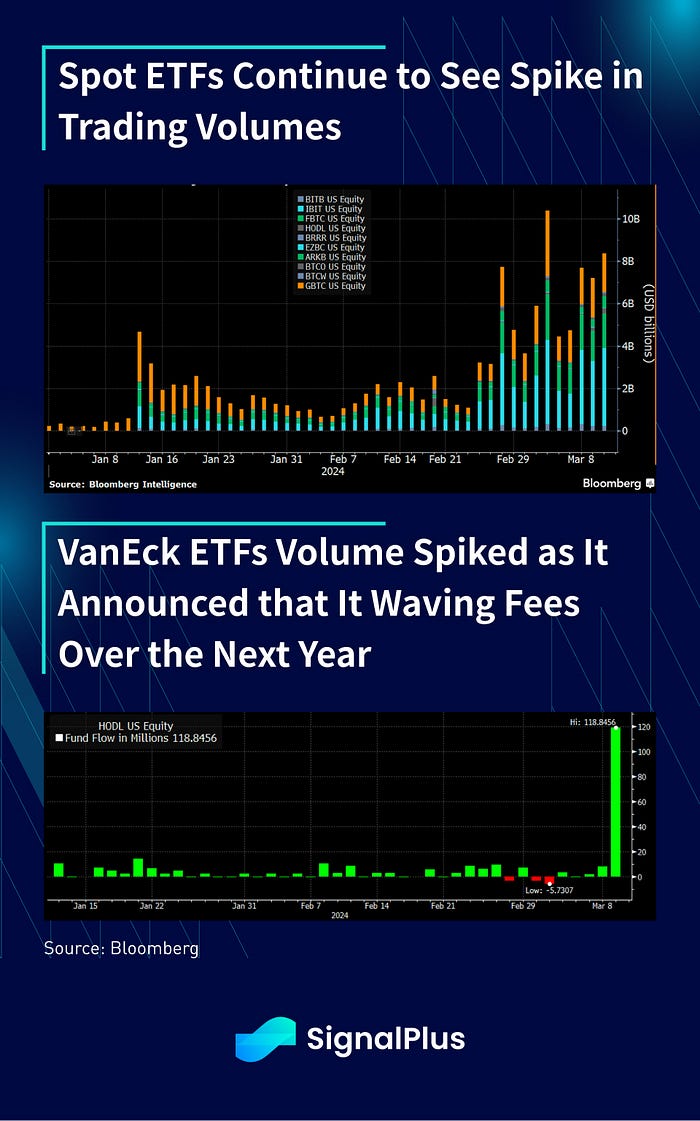 Unsurprisingly, crypto has continued to hold on its gains as well, with spot ETFs seeing another $8.5bln volume day, with VanEck announcing that it was waiving fees for the next 12 months. Net inflows to the ex-GBTC ETFs added $1bln yesterday, more than double GBTC’s ~$500mm in outflows. Total asset AUM held under the ETFs is just a whisker away from $60bln, and the quarter isn’t even over yet.