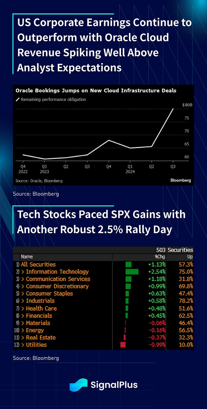 The SPX rallied 1% immediately after the number, and managed to hold to those gains after some choppy morning trading. Technology stocks once again paced gains, with Nvidia rallying another ~9% on the day (why not?), while Oracle jumped 12% on the back of a spike in cloud revenue. Sales backlog came in at $80bln vs expectations of $59bln, with overall revenues jumping 25% in the quarter.
