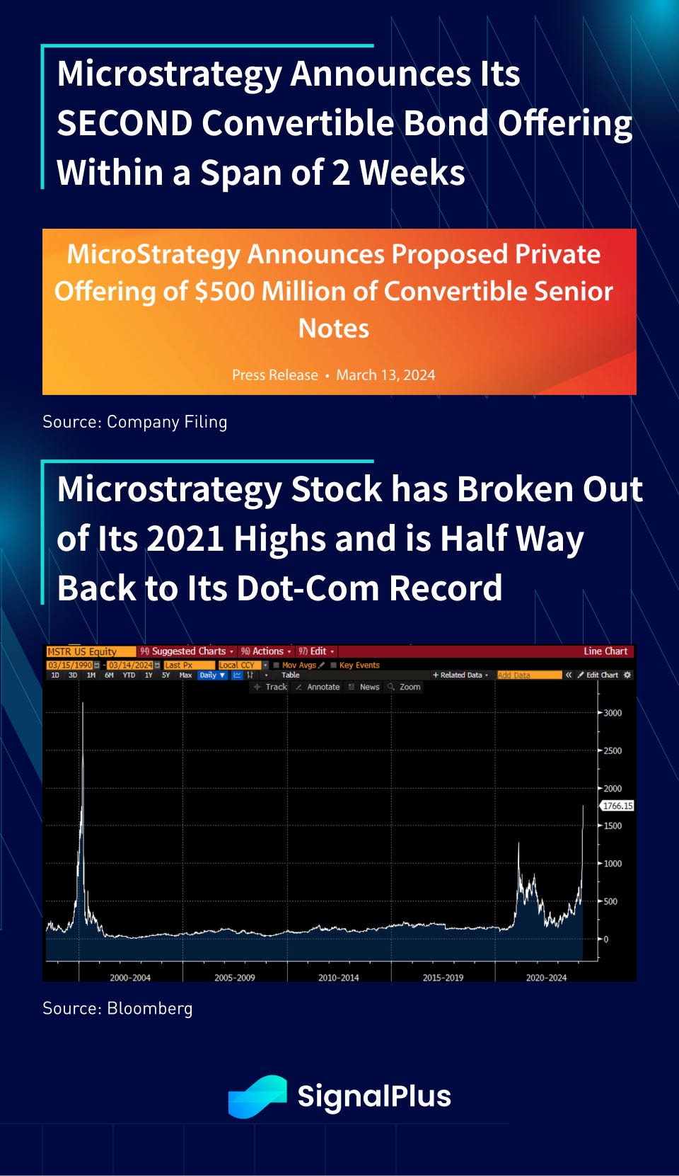 As nothing changes sentiment like price, Microstrategy was able to announce its 2nd convertible issuance with March alone as it raises another $500mm in fiat capital to purchase more Bitcoins. The company has already purchased more than $1bln in Bitcoin in the first quarter of 2024, thanks in large to the proceeds from the sale of the early convertibles which netted over $800mm. The stock has already broken its 2021 highs and is about half way to its dot-com bubble highs from 1999. Will history repeat itself again as the crypto rally continues unabated? We certainly live in interesting times indeed…