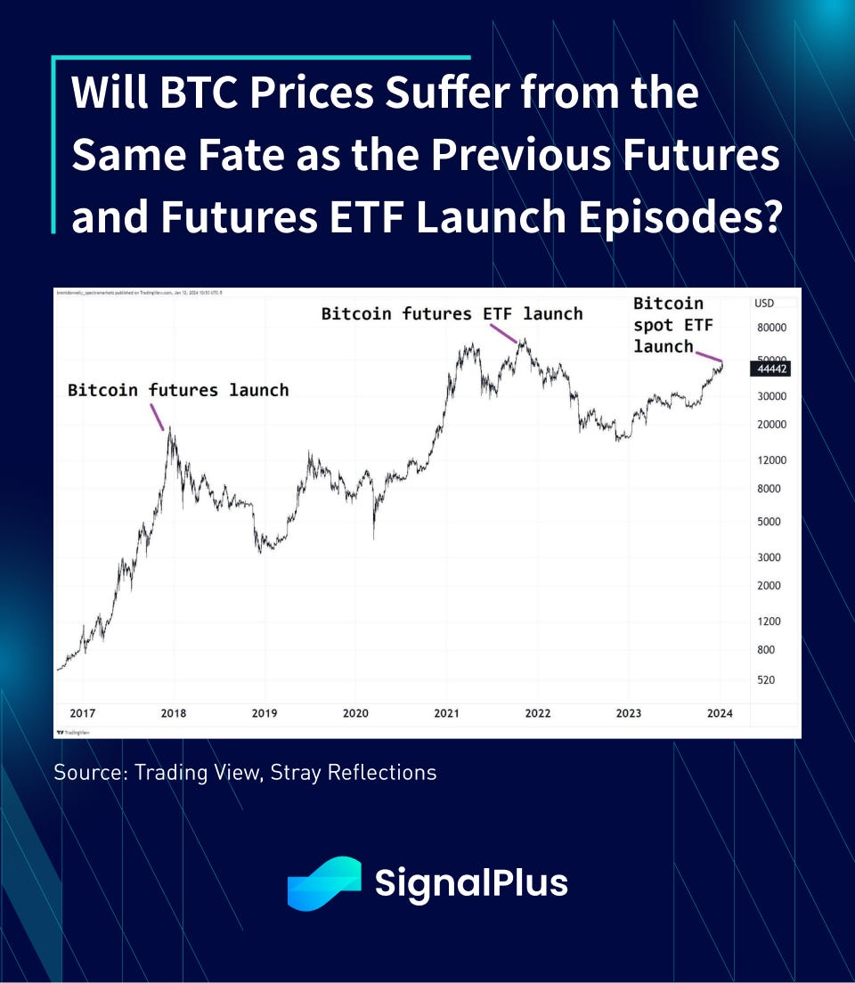 While consensus appears to be blaming GBTC’s outflows for driving spot BTC prices back to $42k, that does not appear to corroborate well with the above data, with the move probably more of a general ‘sell-the-news’ behaviour that appears to be winning out in the current moment. Previous BTC futures and futures ETF launches led to periods of weakness for BTC — will we repeat the same fate once again this time around?