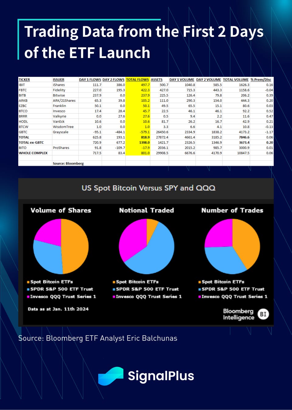 Over in crypto, the first 2 days of ETF trading saw +1.4bln of new inflows from the new ETFs, offset somewhat by GBTC’s -579mm of outflows as reported by Bloomberg ETF analyst Eric Balchunas. The volume and number of trades for the ETF remain impressive versus incumbent leaders such as SPY and QQQ, especially for an asset class that was so vilified by the mainstream public over the past 18 months.