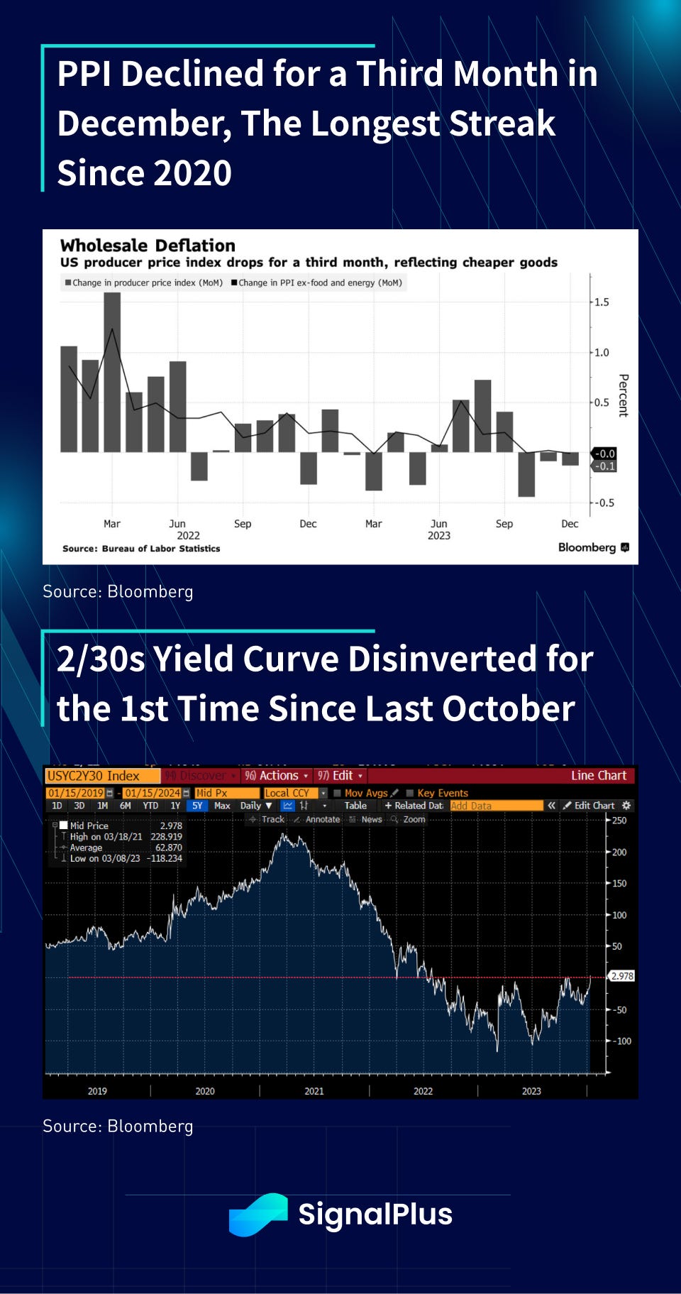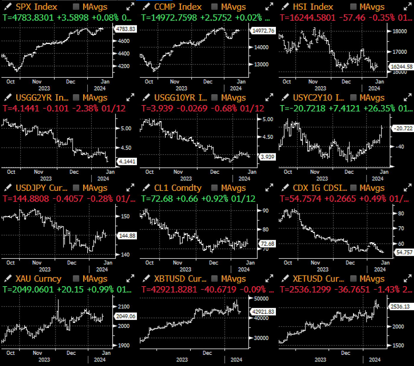 US PPI came in on the soft side on Friday, vindicating the Fed’s dovish pivot and added downside skew to even more cuts to come. Negative revisions to previous data and a drop in core PPI (to 1.8% YoY) caused 10y yields to crater by 10bp on the session, steepening the 2/10s curve back to ‘just’ -20bp, and the 2/30s curve disinverting for the first time since last October. Front-end yields also benefitted from brewing geopolitical tensions, with US/UK join airstrikes against Houthin rebels leading to a 4% strike in crude oil at one point. Fed funds ended the session pricing ~165bps of rate cuts for 2024, a YTD record.