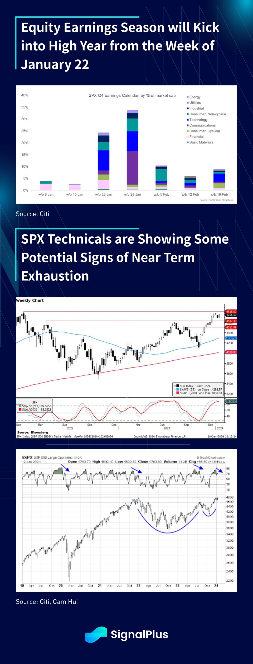 On the equity side, focus will be on earnings season where things will kick into full throttle during the weeks of January 22 and 29, where over 50% of the SPX market cap will be reporting their Q4 results. From a technical perspective, some early signs of fatigue are visible in the broad index after the recent moves, though we are nearing SPX’s ATHs at around 4818 where a weekly break above could signal a further bullish continuation
