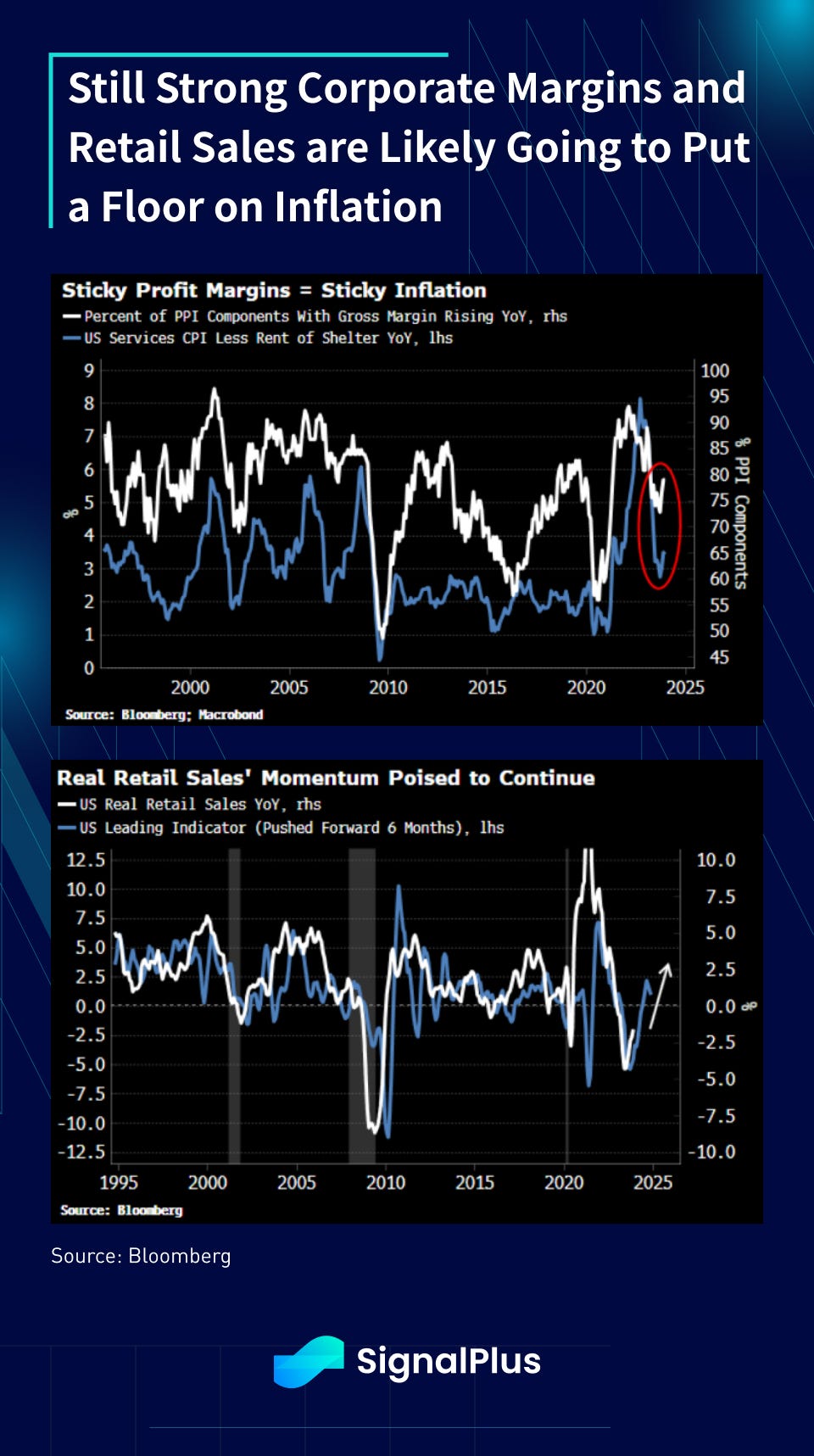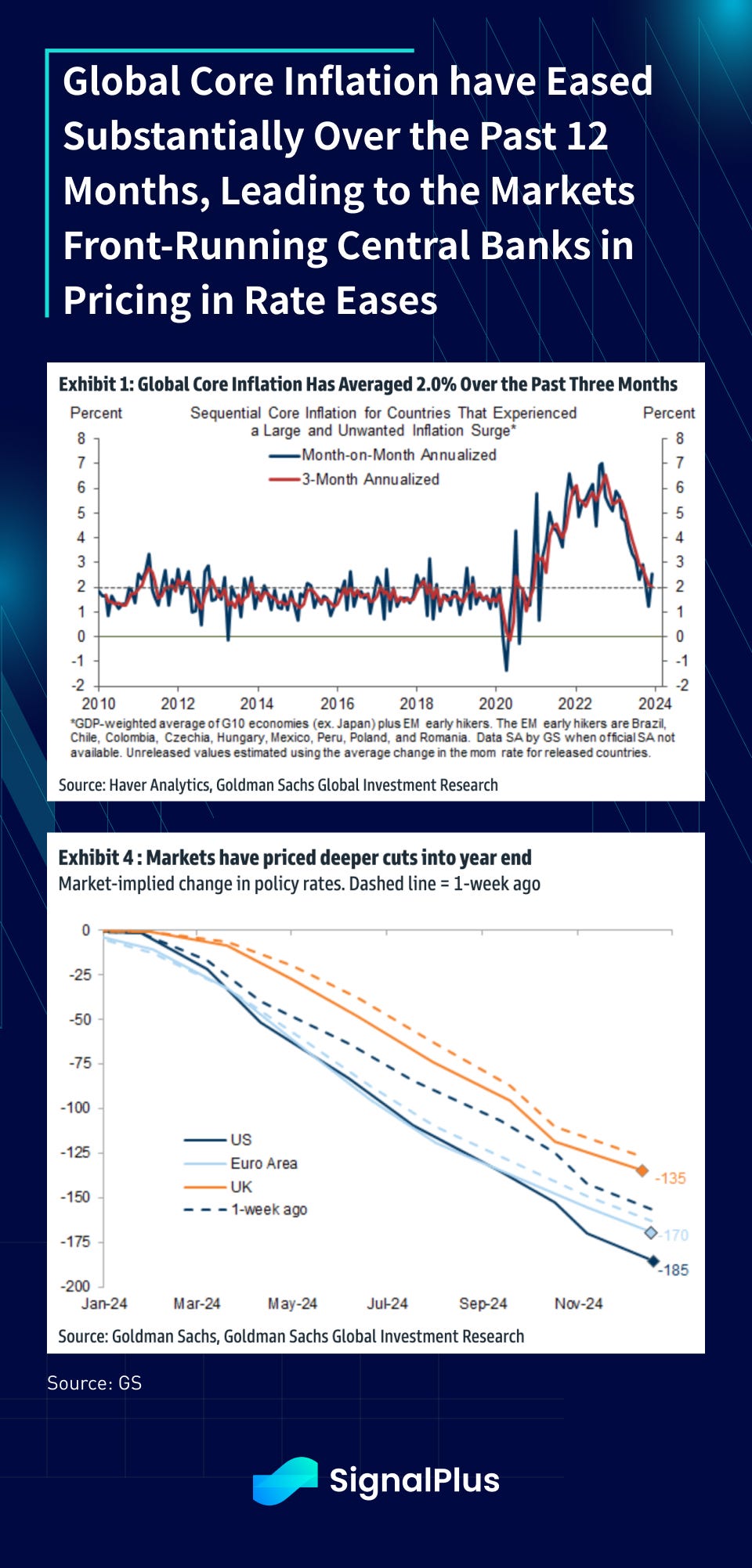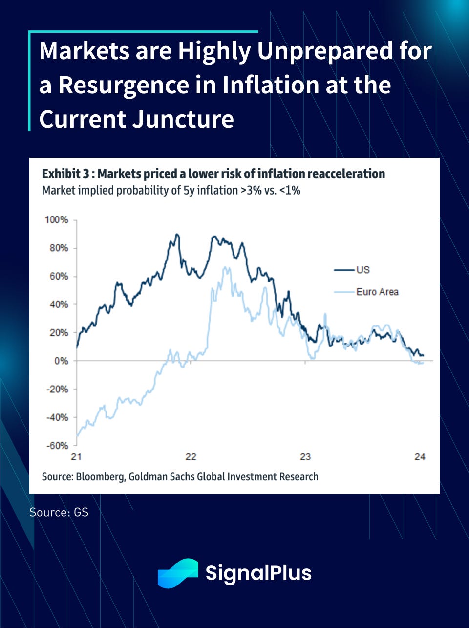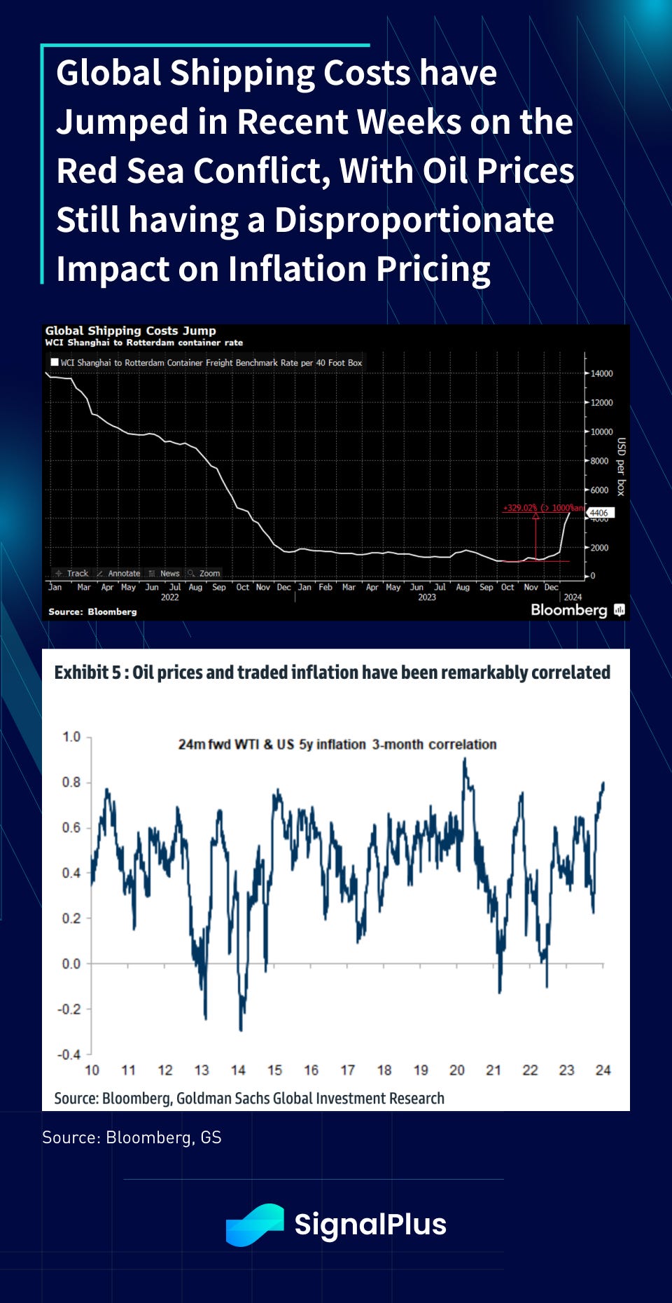 Speaking of disinflation, global core inflation has come down substantially since 2022–2023, averaging 2% based on GS estimates. Markets have not let this go unnoticed, pricing in an increasing amount of rate cuts through 2024 and pushing central banks deeper into a corner to ease. However, this over-zealousness is coming at a time when global shipping costs have started to jump due to the Red Sea conflicts, with oil’s correlation to inflation pricing staying near record highs. Furthermore, sticky corporate profit margins and still healthy retail sales will likely keep a floor on how low price inflation can go, just as markets are the least prepared for an inflation resurgence at this point. Something to keep in mind as we head further into 2024.