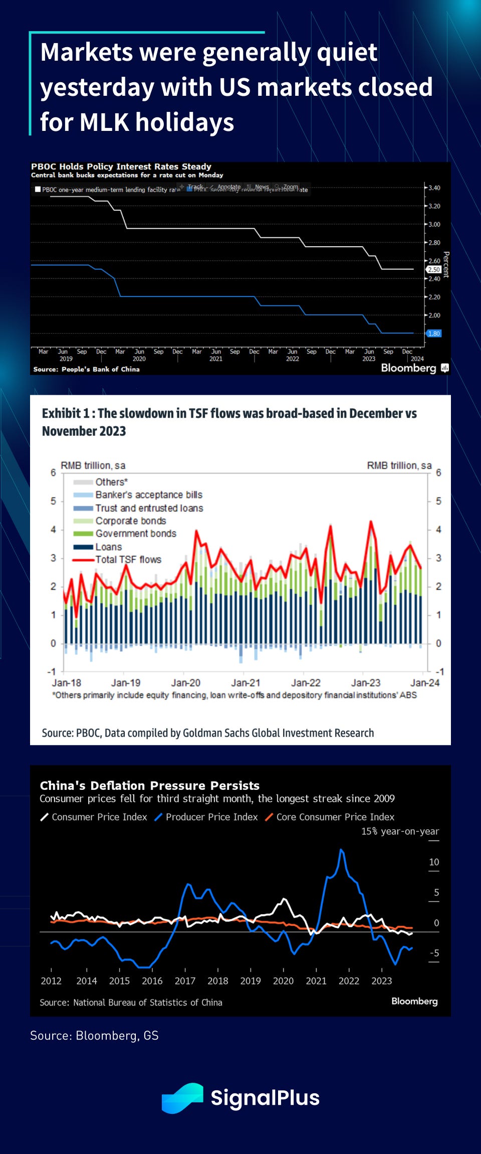 Markets were generally quiet yesterday with US markets closed for MLK holidays. The Asia session started with another China disappointment as PBOC surprisingly kept their MLF rates unchanged this month. Despite a worsening slowdown in TSF led by softer bank loans, and both CPI and PPI now firmly in deflationary territory. China stocks continue to lag world