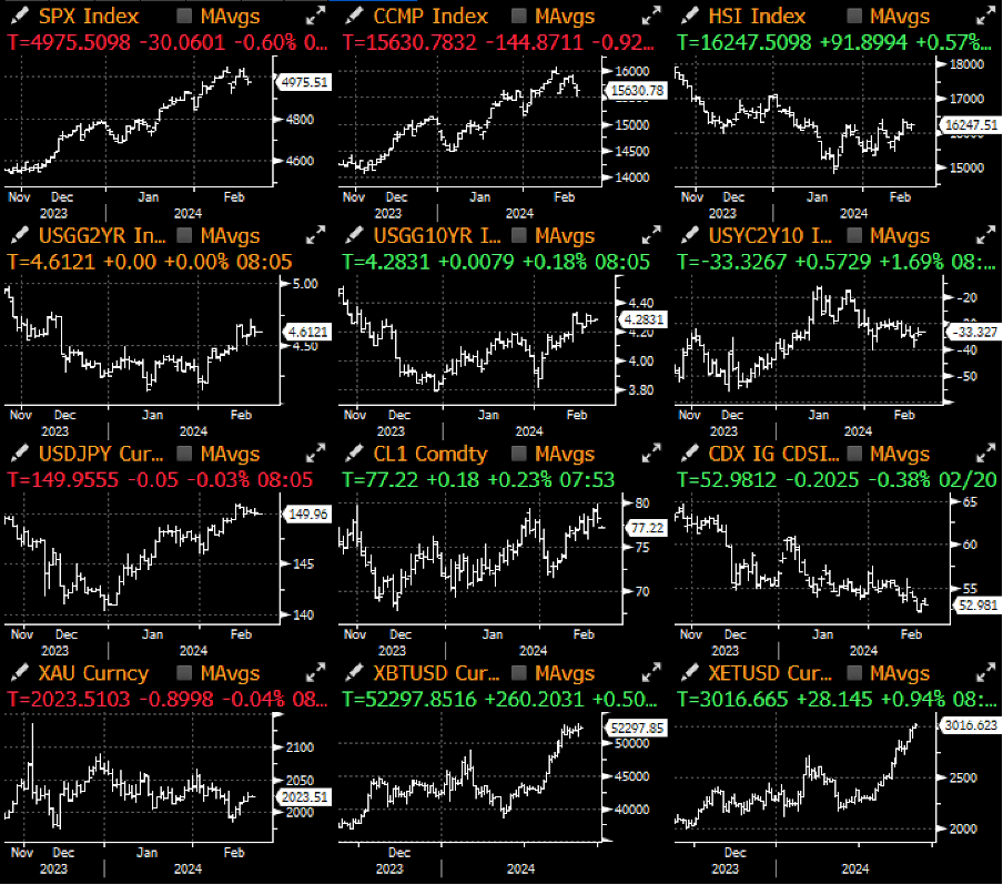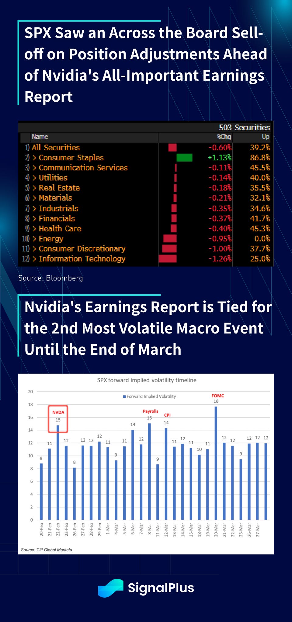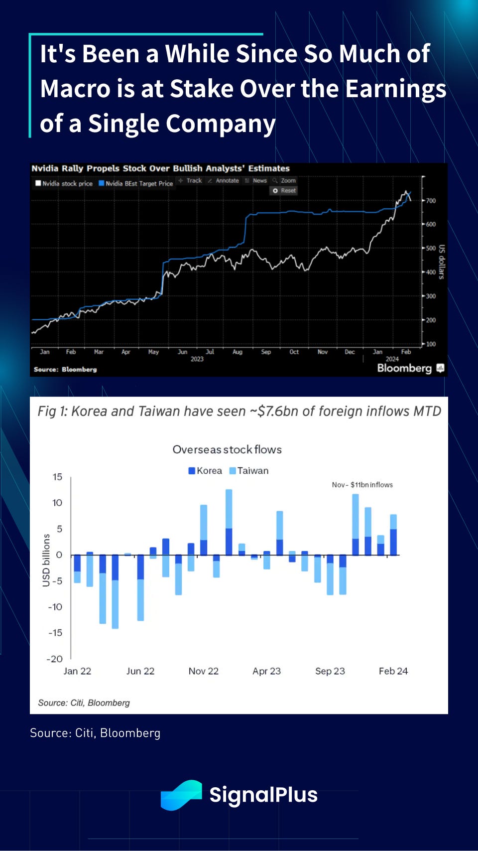 Nevertheless, equity markets did see a retracement yesterday as SPX saw an across the board sell-off, led by tech, as we head into the all important Nvidia earnings report later today. Without trying to over-state its importance, this earnings is being priced as the 2nd-most significant market moving event until the end of March, coming in just below the March FOMC and tied with the upcoming NFP release. Furthermore, on an individual basis, Nvidia’s option-implied move of 10.6% is around the highest range of its historical earnings releases going back to 2012, which is equivalent to a daily market cap impact of +/- $180 billion, for those of us who are counting. The AI FOMO theme is also evident through nearly $8 billion of foreign inflows into Korea and Taiwan equities YTD, so it’s probably fair to say that a lot is riding on this single earnings release.