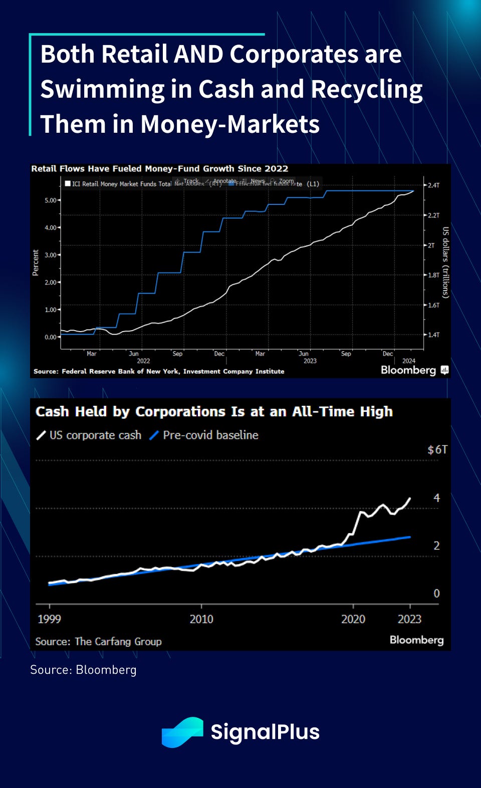 Furthermore, it’s not just moms-and-pop that are putting $ into savings accounts, but corporates are also sitting on a record $4.4 trillion of cash and recycling them into T-bills. As such, it’s hard to be too bearish risk assets and equities, outside of a trade, against this ocean of liquidity support in the US.